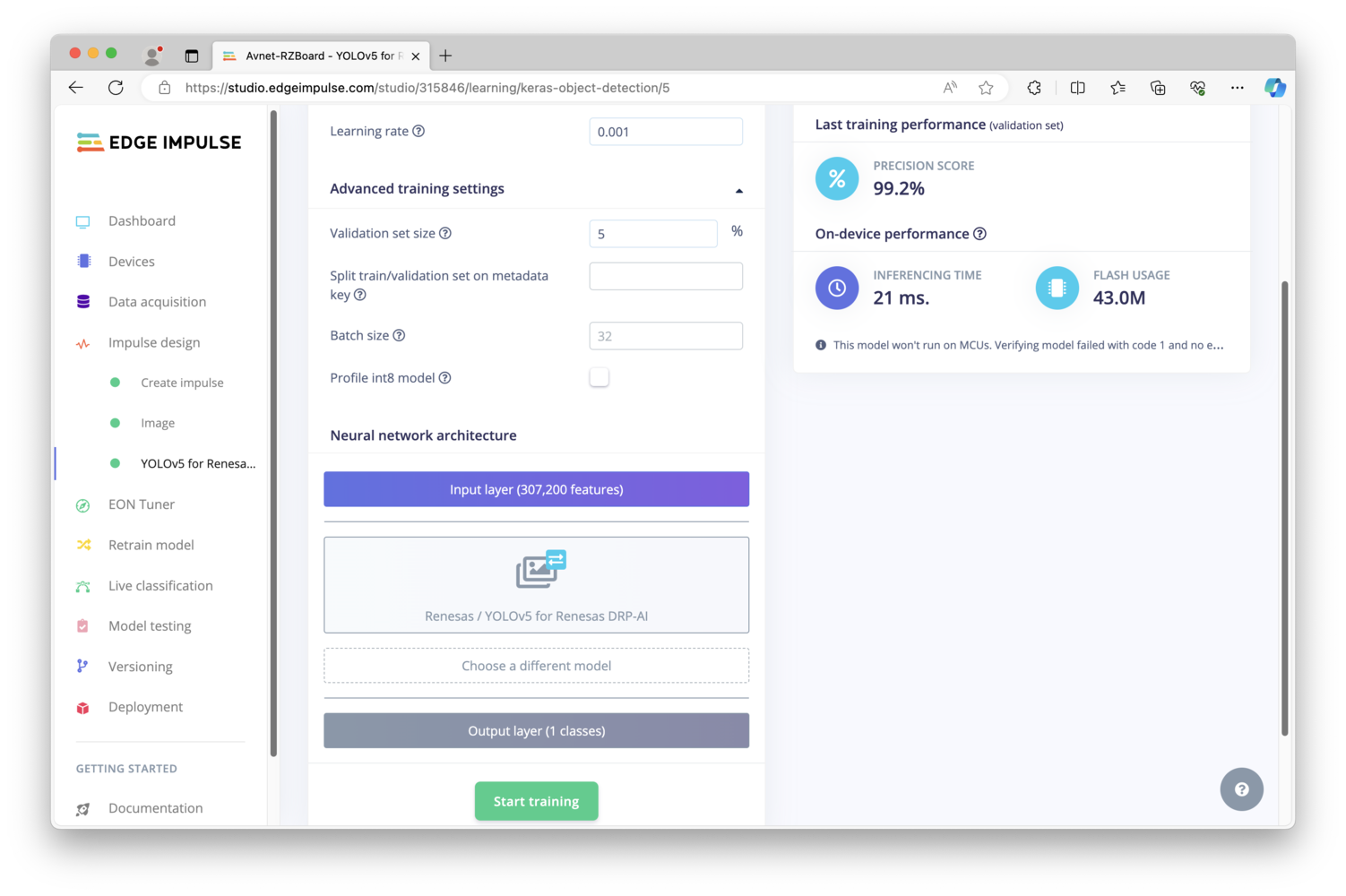 After the images have all been labeled, it is time to move on to the machine learning model creation phase. Click on “Impulse design” on the left, and you will see 4 columns (2 of which are empty for the moment), that will make up the machine learning pipeline. The first column is the input, which should be pre-populated with “Image data”. You can however, increase the image height and width to 320 by 320, as the RZBoard will have plenty of processing power available to make use of the larger image size (more on that in a bit). In the second column, click “Add a processing block”, and choose “Image” by clicking “Add”. In column 3, click “Add a learning block”, and choose “YOLOv5 for Renesas DRP-AI” by clicking “Add”. Finally, the fourth column should be pre-populated as well, with only one Output feature, the label we created earlier calledm5_nut