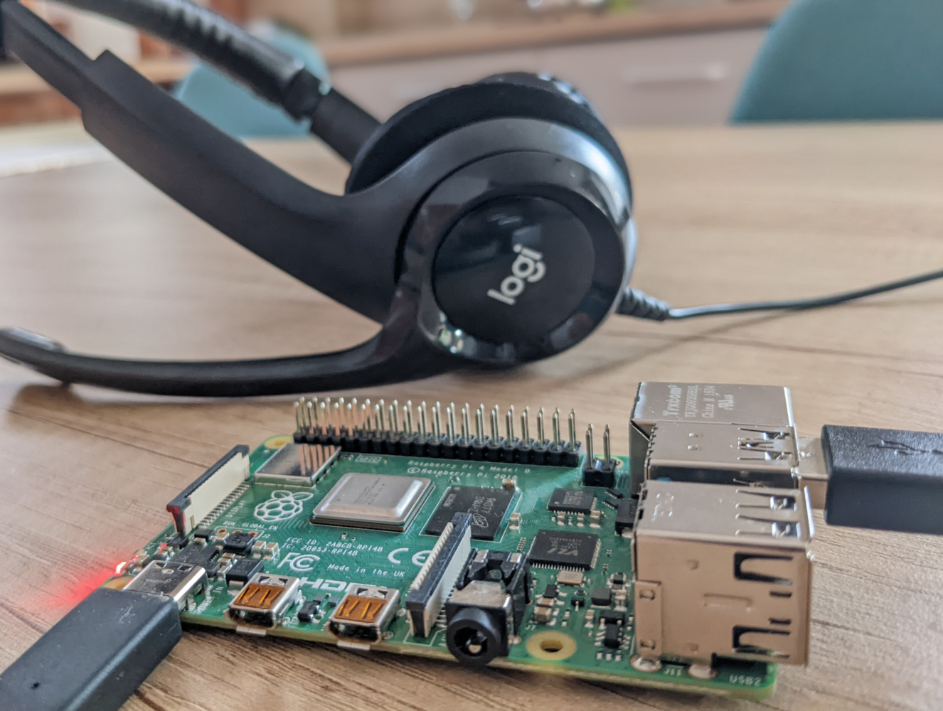 The hardware we will use is a Raspberry Pi 4 (2GB) development board, along with a Logitech USB headset used as the microphone input.