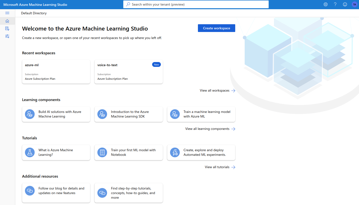 The functionality offered by Azure Machine Learning is accessed via the Azure ML Studio. As a prerequisite to accessing Azure ML Studio, we will need an Azure account and an active Subscription. Users whoa are new to Azure can also create a free account, with one year of free services and some credits for experimentation. Opening the Azure ML Studio brings us to a welcome page: