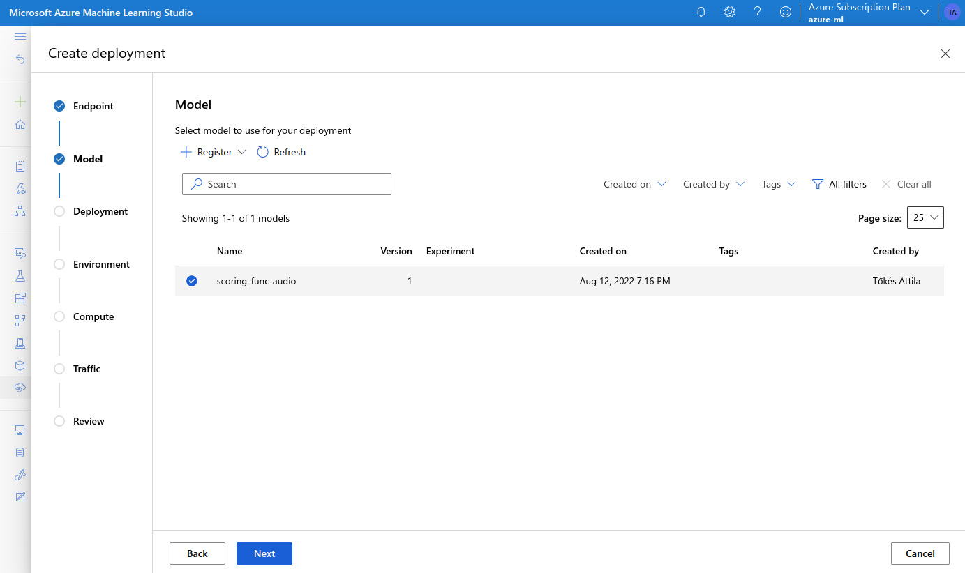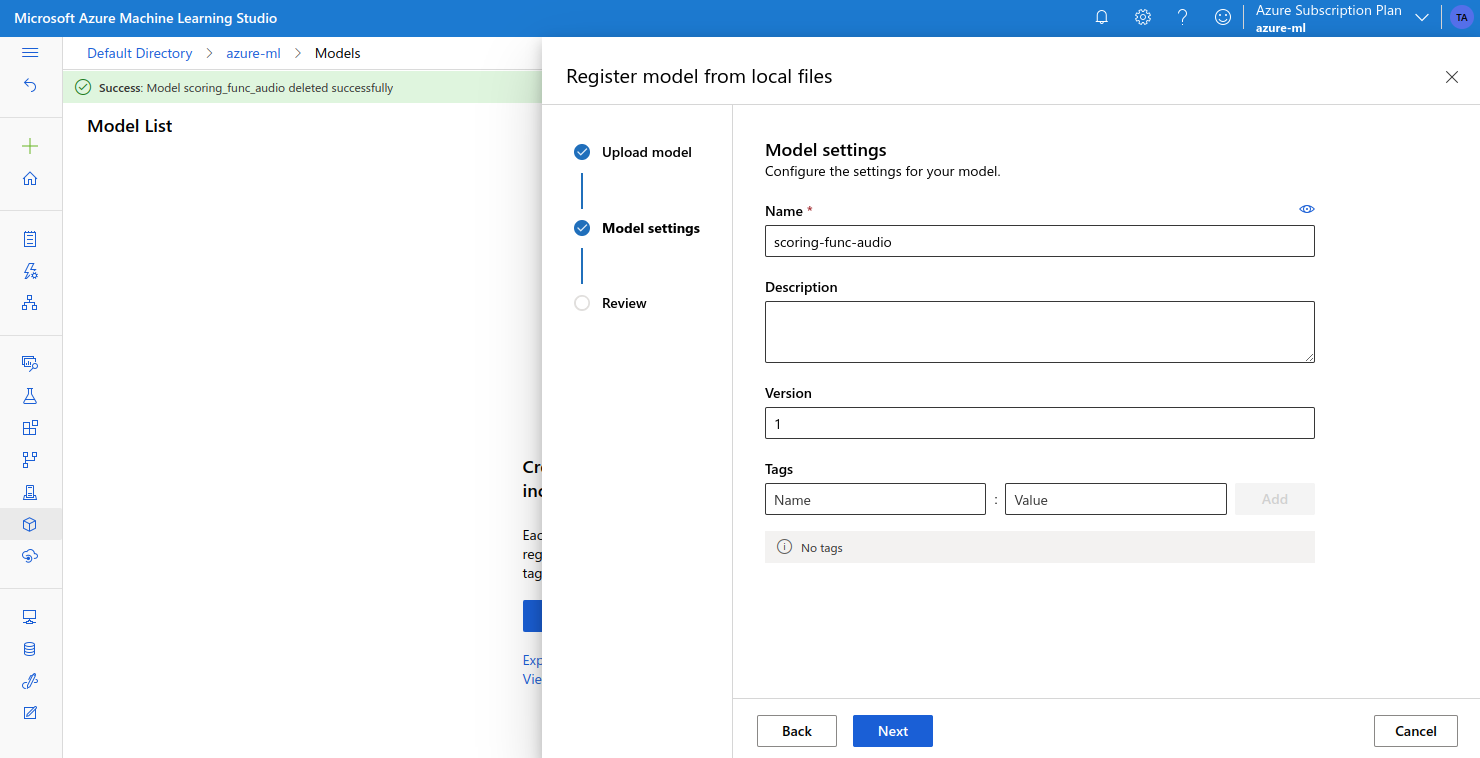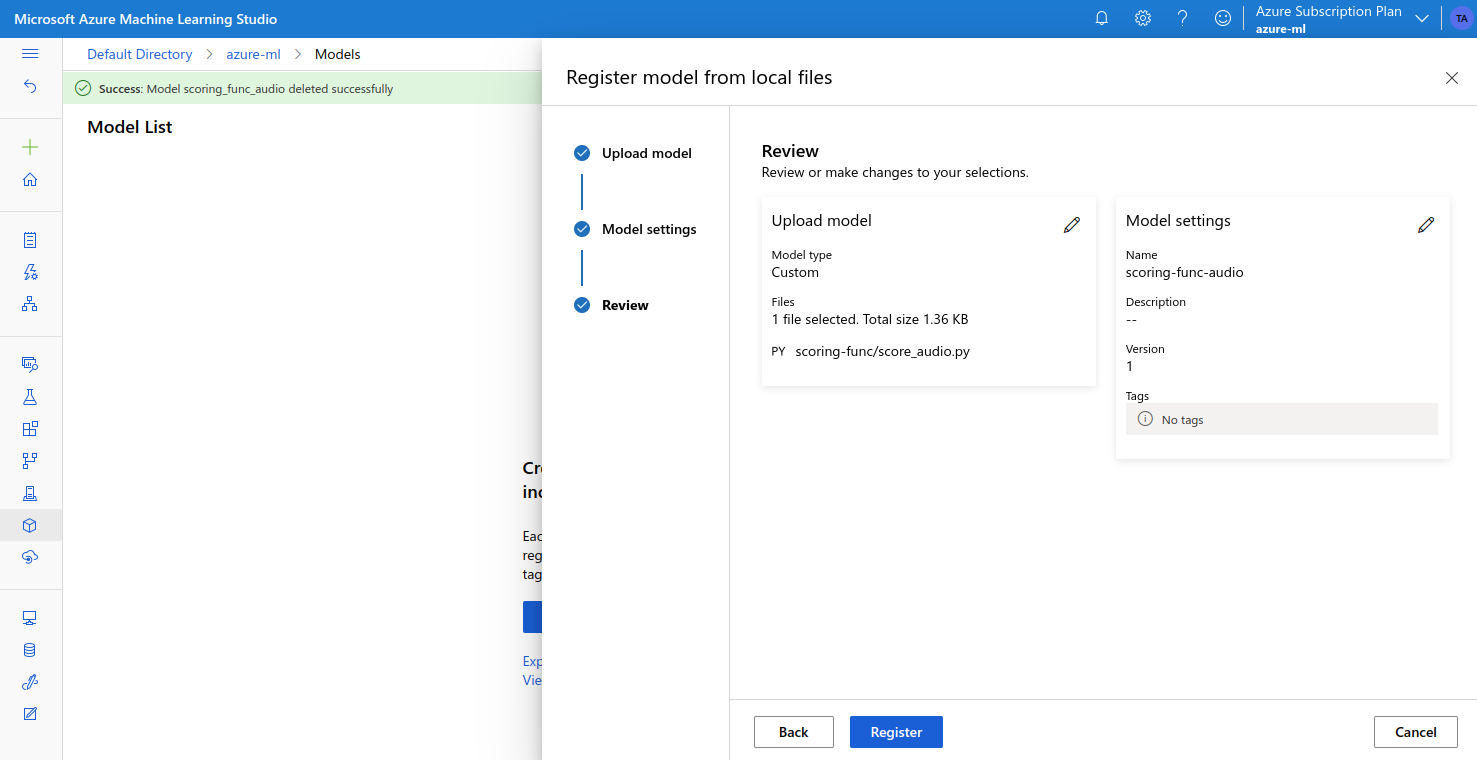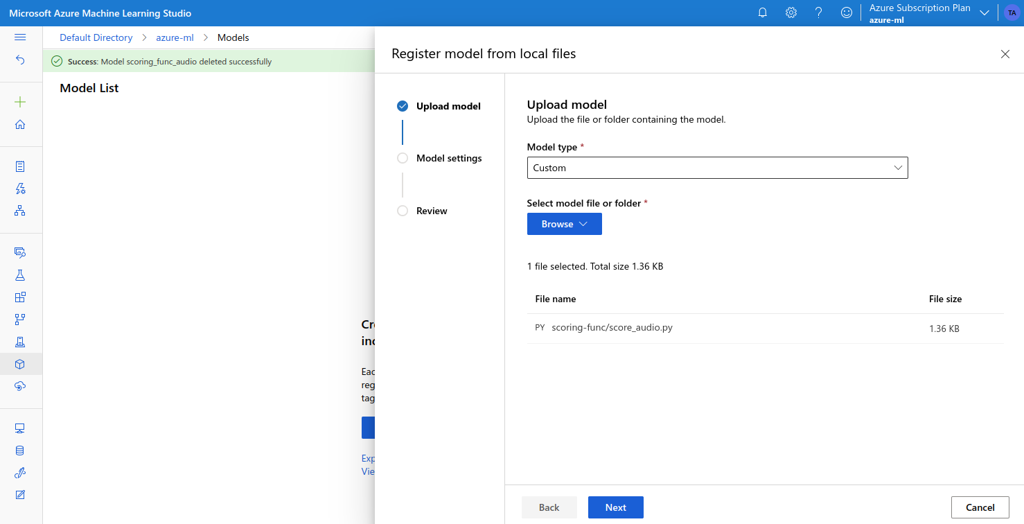 We can upload this to Azure ML from the Models page:
