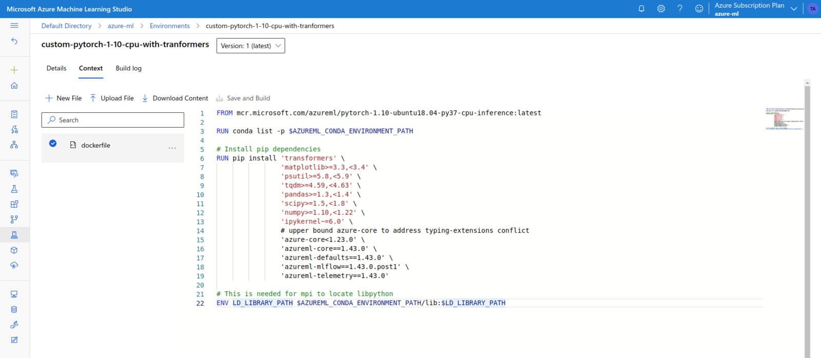transformers, we need a Custom Environment. This can be created from the Environments page. We can choose to start from a Curated Environment, or we can use our own Dockerfile. After multiple tries, I ended up creating a Custom Environment based on the mcr.microsoft.com/azureml/pytorch-1.10-ubuntu18.04-py37-cpu-inference image.