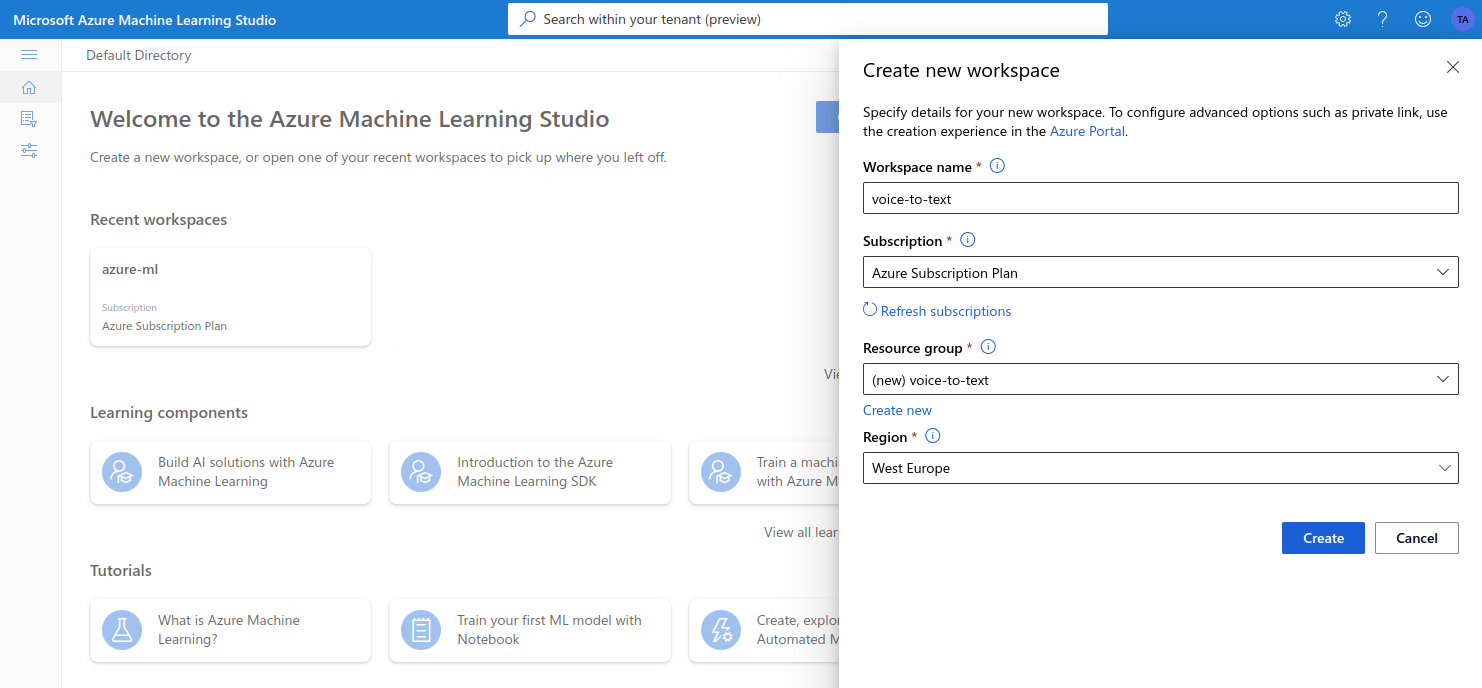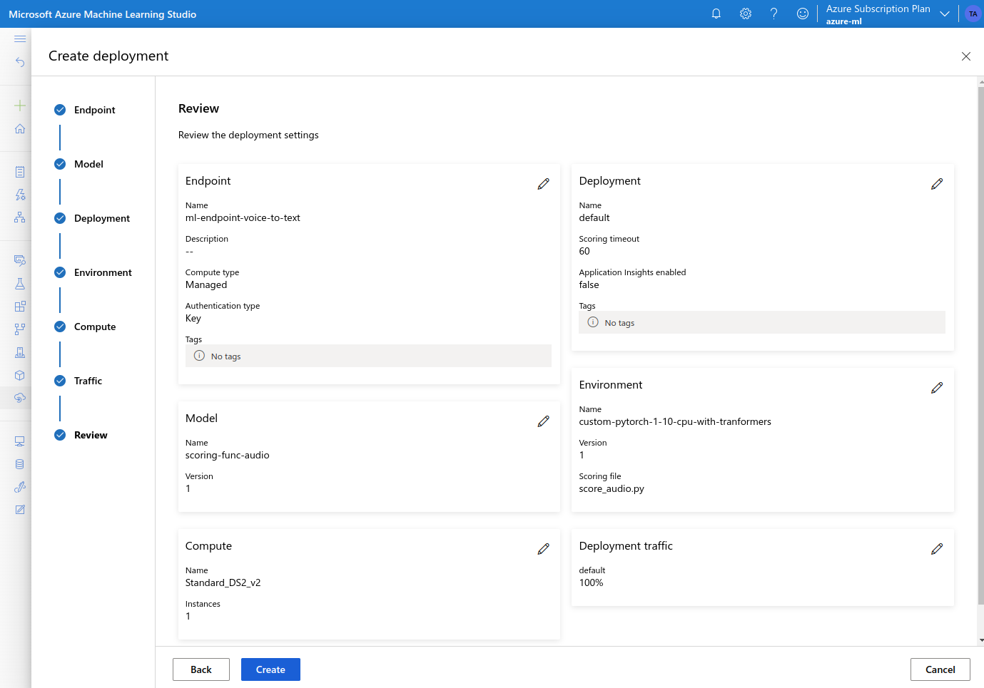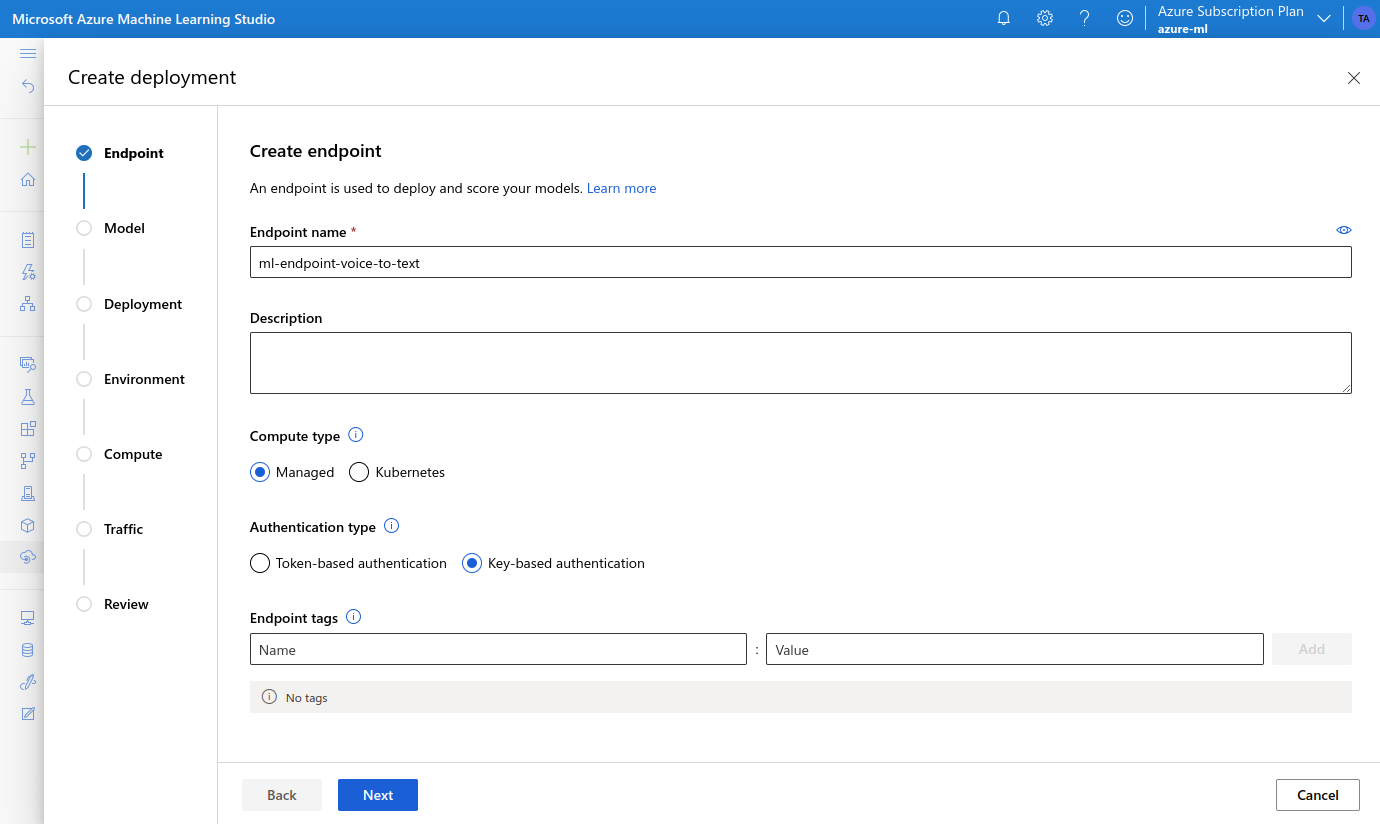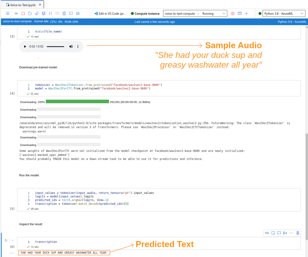 Azure Machine Learning is Microsoft’s cloud offering of machine learning services, covering the machine learning project lifecycle, including training and inference. It supports all the popular open-source machine learning frameworks such as TensorFlow, PyTorch and others. In this section I will show how to implement a voice-to-text translation endpoint with Azure ML.The Model