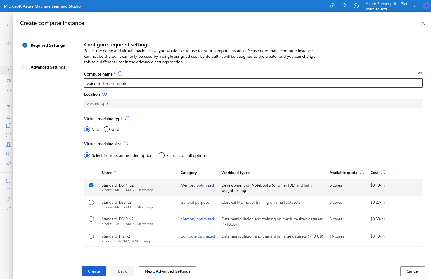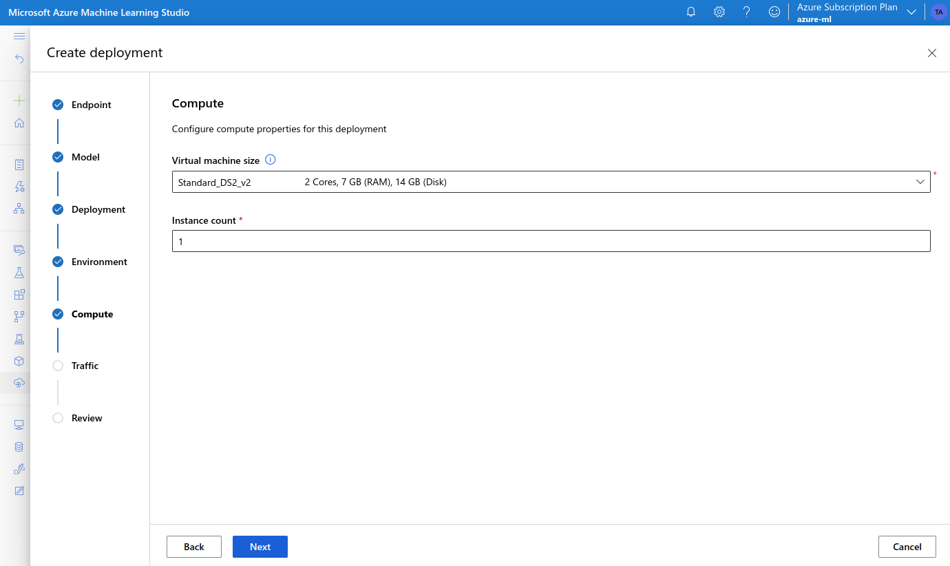 - choose a VM type, and set the Instance count to 1