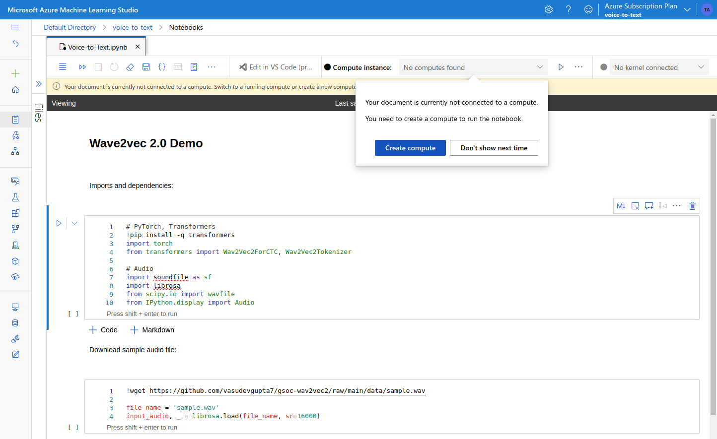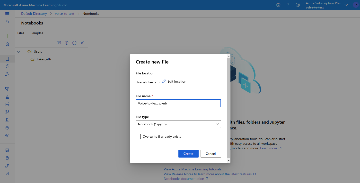 On the workspace overview page there are a couple of quick actions to choose from. I think Notebooks can be a good starting point. Notebooks allows us to work with a custom version of Jupyter Notebook, a tool which should be familiar for most people involved with ML projects. On the Notebooks page, we can either choose to create a new notebook, or to an upload existing one. I went ahead and created a new notebook, as I wanted to experiment with the Wave2Vec 2.0 model.