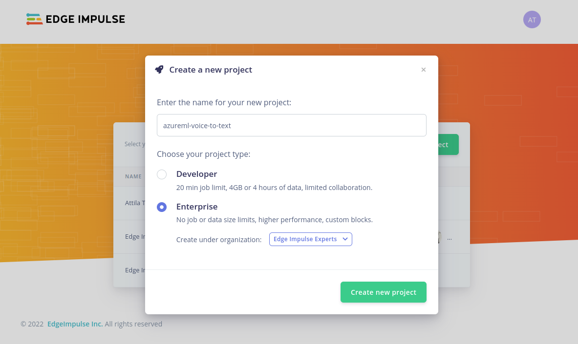 Next, we can login to the Edge Impulse Studio, and create a new project: