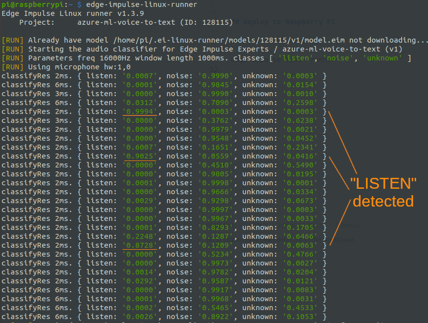 The edge-impulse-linux-runner tool automatically downloads and optimizes the model for the Raspberry Pi. Then it runs a sample app that continuously analyses the input audio, and gives the probabilities of the predicted classes: