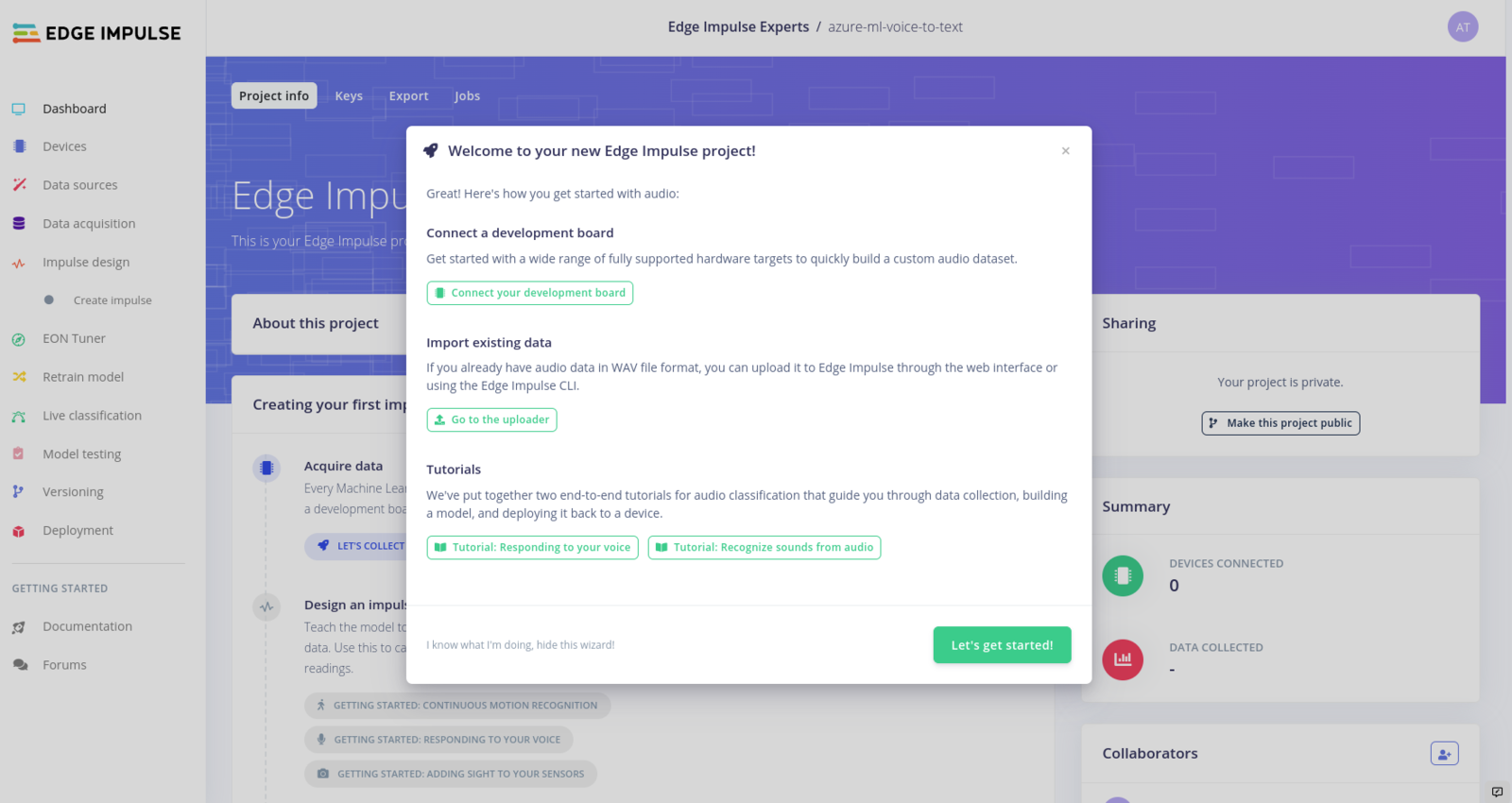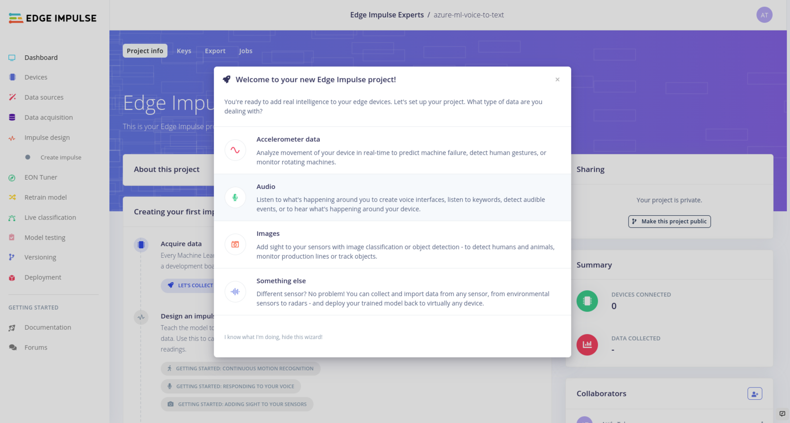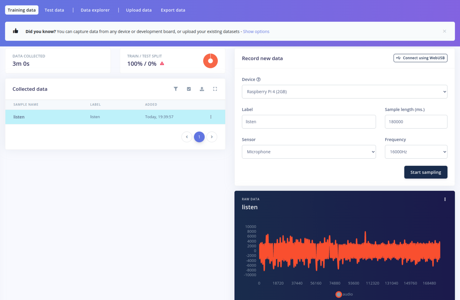 Now we can start building our keyword spotting model. Edge Impulse has a great tutorial on this: Keyword spotting The first step in training a keyword spotting model is to collect a set of samples of the word we want to detect. This can be done in the Data Acquisition tab: