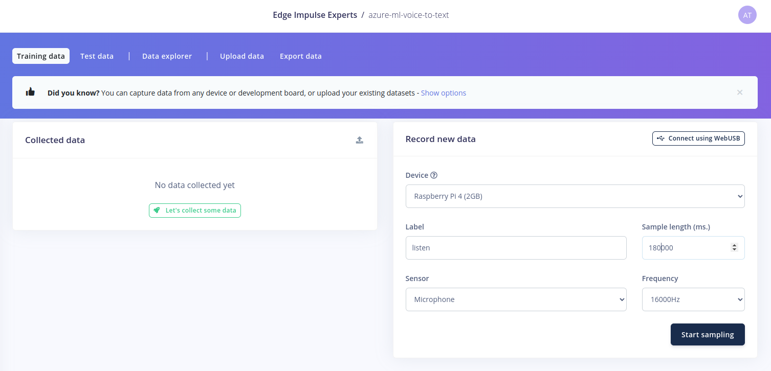 Edge Impulse is the leading development platform for Edge Machine Learning (Edge ML). It enables the creation of smart solutions via efficient machine learning models running on edge devices. As a demonstration we will implement a voice-to-text application on a Raspberry Pi. The solution will feature a keyword spotting model implemented with Edge Impulse, as as well the Cloud ML endpoint we created in the previous section.Hardware