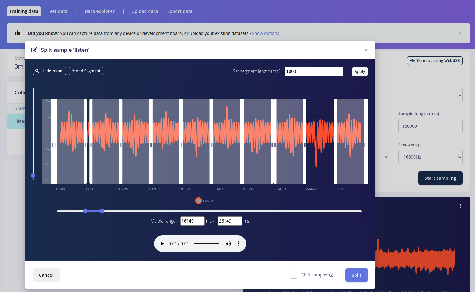 - use the Edge Impulse Uploader tool to upload the samples to our project: