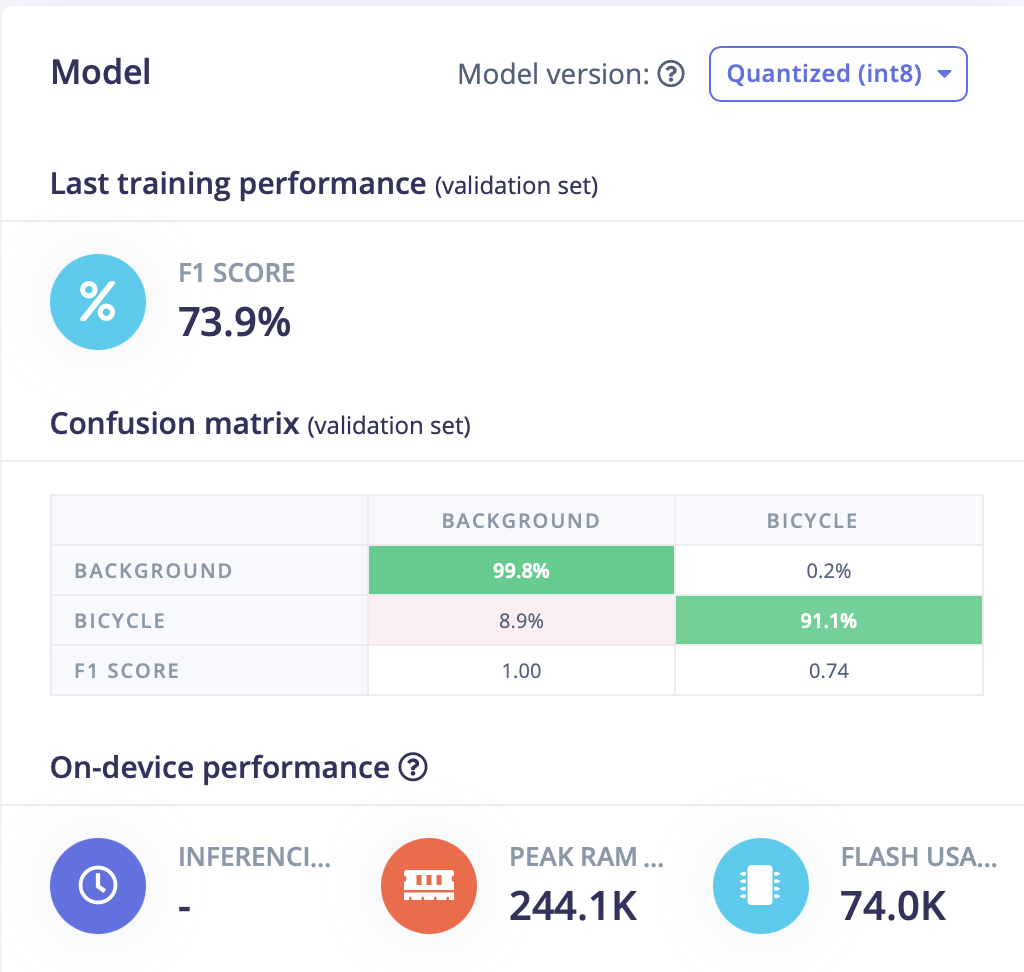 In order to build a Tiny ML model, you of course need a dataset. I wanted to be able to count the number of cyclists in an image, incase a group of riders passes the sensor. With Image Classification, you just know if there is one or more bicycles in an image - you don’t get a count of how many. Edge Impulse’s FOMO model is based on Object Detection and allows you to count how many instances of an object are present in an image. Object Detection models need images with bounding boxes defined for objects and labeled appropriately. I started out by looking for existing data sets with labeled images of cyclists. I did find a couple data sets that included labeled cyclists: (BDD-100, and Tsinghua-Daimler Cyclist Detection Benchmark Dataset). However these models I trained from these dataset did not work well. While the images in the dataset were rather large, many of the labeled instances of cyclists were very small. When these images were shrunken down in order to match the model’s size (96x96px), the resulting cyclist was only a few pixels high. While this approach initially looked promising, clearly this was not going to work. Luckily Edge Impulse makes it easy to collect your own dataset using a smart phone and their web app. In order to bootstrap my model with images of cyclists, I walked around town and took pictures of the different riders, as well as similar photos with no cyclist present. After about 100 images or so, I labeled all of the images with bicycles in them. For the images I captured, I tried to make sure the cyclist took up a lot of the frame to help make sure the model had enough data to train on. The photos were taken in an area near where I would be placing the sensor, so the backgrounds were representative of what the sensor would see. When I trained the model on this data set, I ended with a model that was a lot more accurate. Of course with 100 images it was still far from perfect but it was good enough to deploy in a sensor and begin automatically collecting images to help further grow a data set.