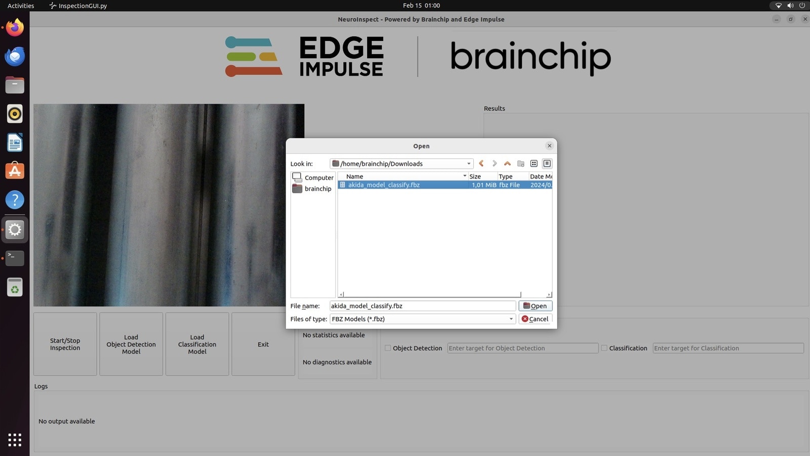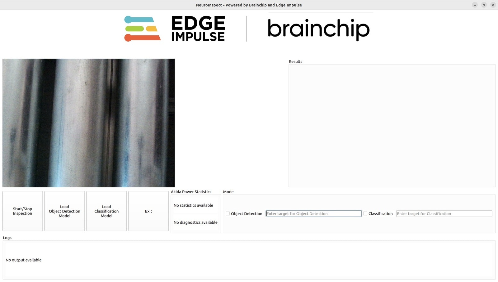 To create an inspection system, a local GUI client based on Qt is used, written in Python. Thanks to the native acceleration provided by Akida, using Python does not affect performance as all ML inference takes place in hardware in the neuromorphic SoC. Dependencies need to be installed for the app, including OpenCV and PyQt5 which are installed with the following commands: