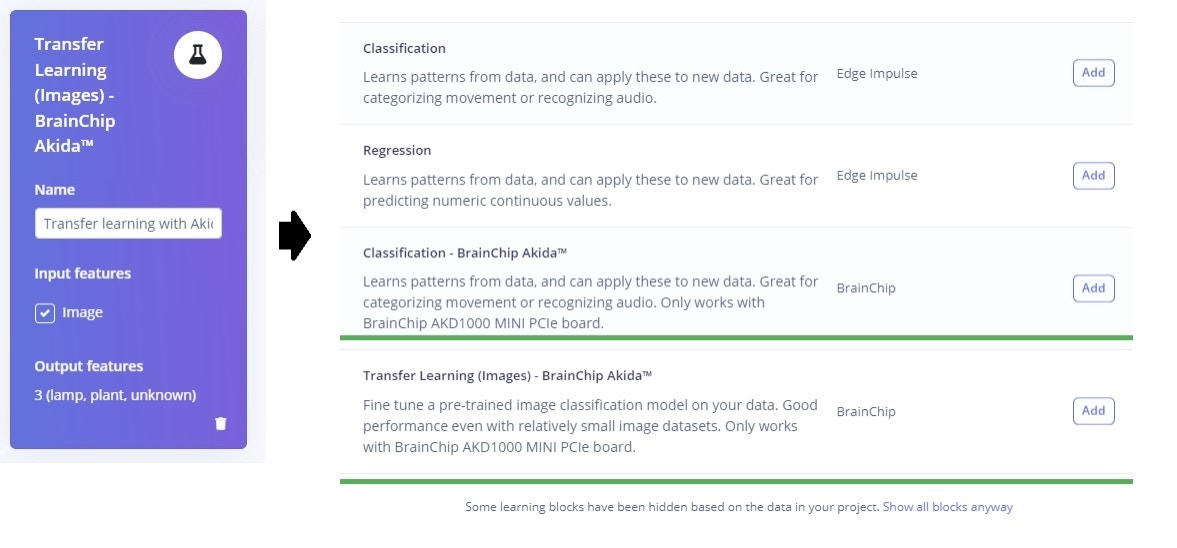 For an industrial automation engineer, or anyone not familiar with deep learning, this can seem daunting and slows down the efficacy of deploying AI-based inspection systems. The fastest path to market in the past has been expensive proprietary camera hardware and software solutions that abstract the process with complicated licensing, and limited access to the underlying platform. However, the Brainchip Akida acts as a co-processor, enabling you to use your existing x86 or Arm-based platform to have full freedom on your final application. From the software perspective, Edge Impulse eliminates that complexity and cost and provides a solution that offers a flexible way to collect data using the Brainchip hardware, or any other device with a camera, even your mobile phone. The process of building the ML model is intuitive and straight-forward, and thanks to Edge Impulse’s built in support for the Akida AKD1000, Edge Impulse generates a model that is optimized and performs the Akida workflow for you automatically in the background, with the result being either a.fbz model or Edge Impulse’s extremely useful .eim executable model format.