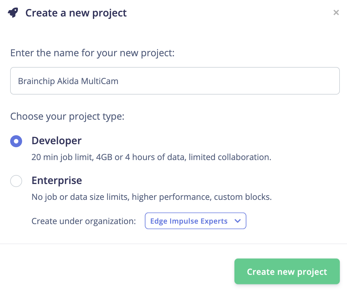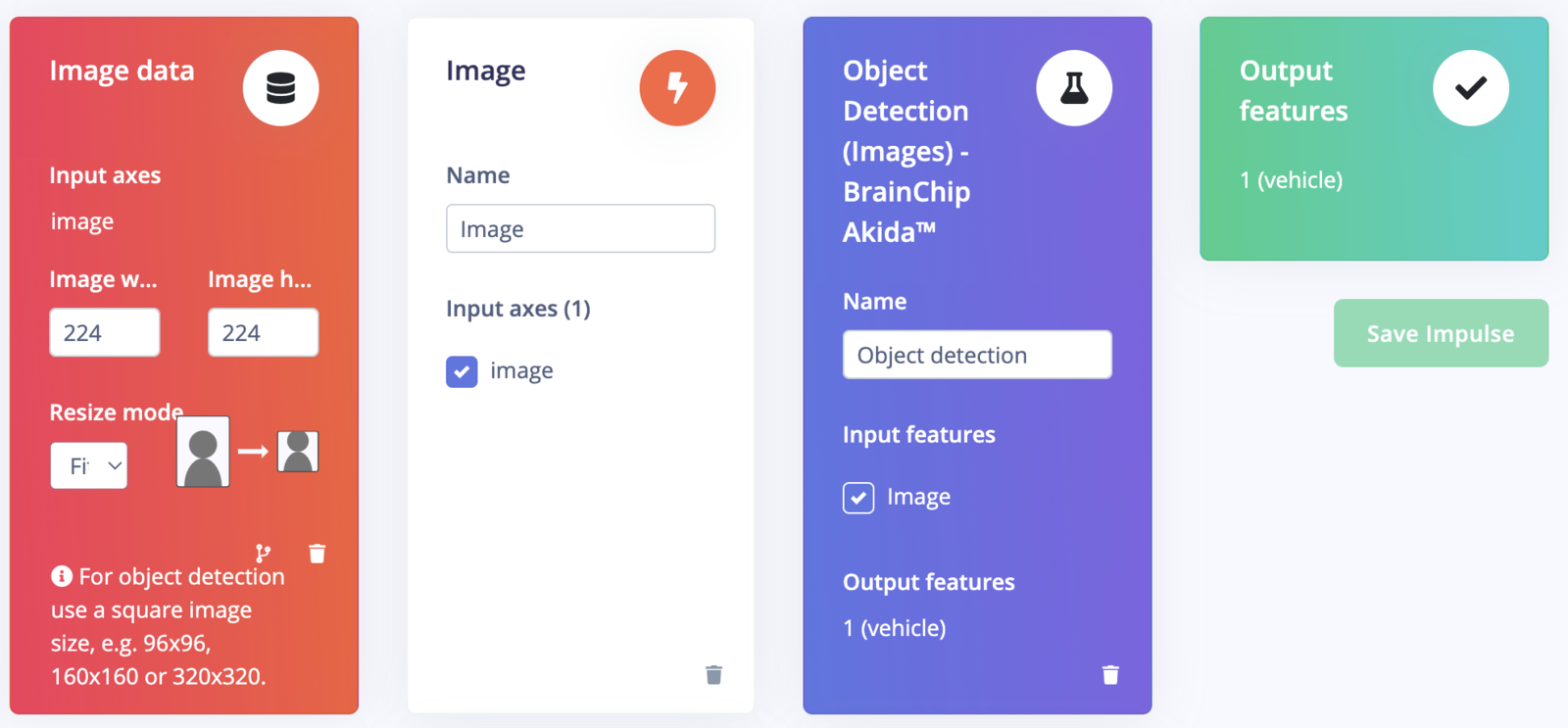 Go to the Impulse Design > Create Impulse page, click Add a processing block, and then choose Image. This preprocesses and normalizes image data, and optionally allows you to choose the color depth. Also, on the same page, click Add a learning block, and choose Object Detection (Images) - BrainChip Akida™ which fine-tunes a pre-trained object detection model specialized for the BrainChip AKD1000 PCIe board. This specialized model permits the use of a 224x224 image size, which is the size we are currently utilizing. Now click on the Save Impulse button.