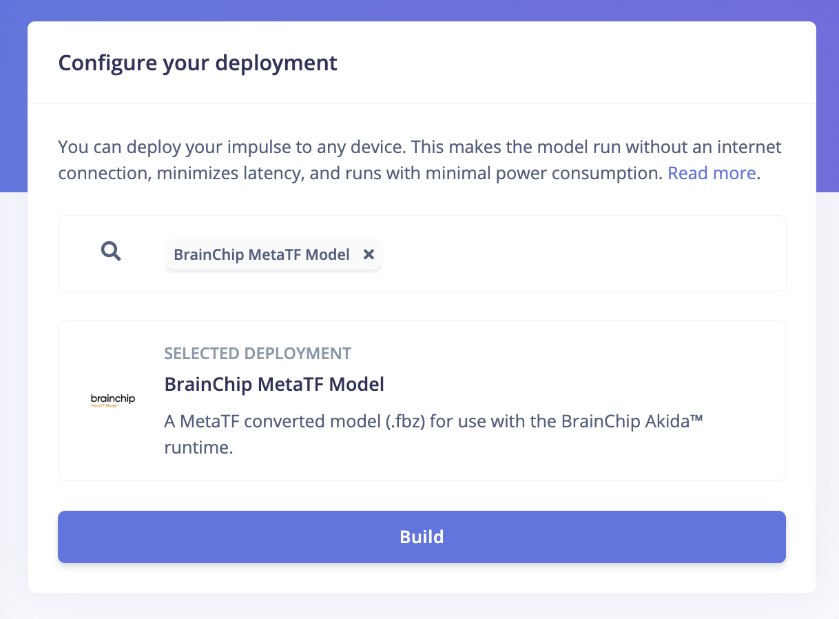 In order to achieve full hardware acceleration models must be converted from their original format to run on an Akida PCIe card. This can be done by selecting the BrainChip MetaTF Model from the Deployment page. This will generate a .zip file with models that can be used in the application for the AKD1000. The build process uses the CNN2SNN toolkit to convert quantized models to SNN models compatible with the AKD1000.
