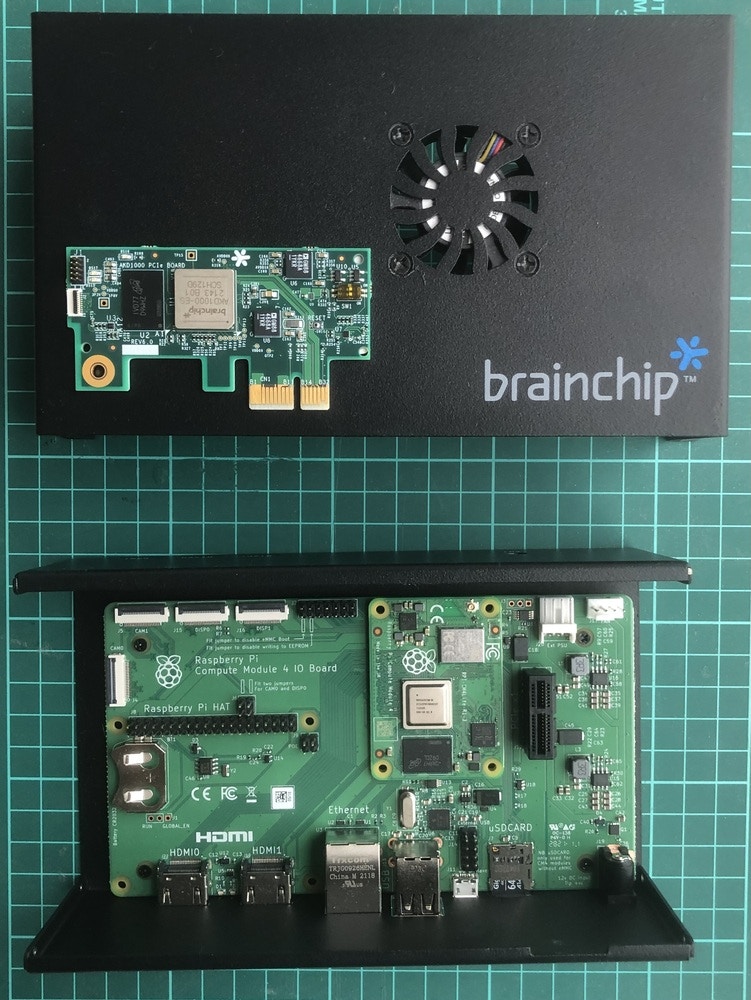 In this project, we aim to build a pipeline that is both flexible and scalable for streaming and inference of multi-camera videos. We will utilize BrainChip’s Akida Development Kit. to optimize and accelerate the Edge Impulse FOMO model near the data sources to decrease the bandwidth and latency requirements for video streaming and analytics. The BrainChip’s neuromorphic processor IP uses event-based technology for increased energy efficiency. It allows incremental learning and high-speed inference for various applications, including convolutional neural networks, with exceptional performance and low power consumption. The kit includes a PCIe board with an onboard AKD1000 Akida processor, a Raspberry Pi Compute Module 4 (Wi-Fi, 8 GB RAM), and a Raspberry Pi Compute Module 4 I/O (carrier) board. The kit is shown below in a disassembled state.