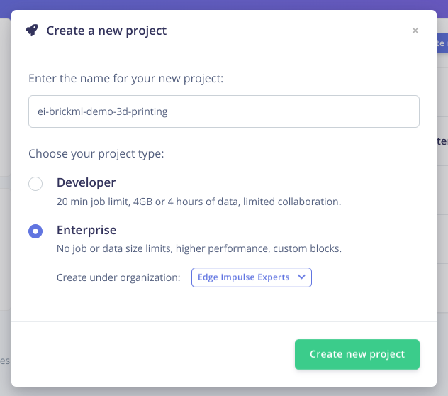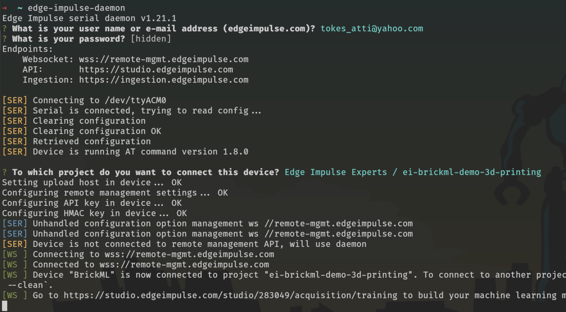edge-impulse-daemon will ask our Edge Impulse Studio email and password. After this the BrickML should be automatically detected, and we will be asked to choose a Studio project we want to use.