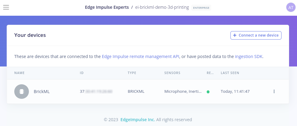 Once connected, the BrickML will show up in the Devices section of our Edge Impulse Studio project, and it should be ready to be used for data collection and model training.