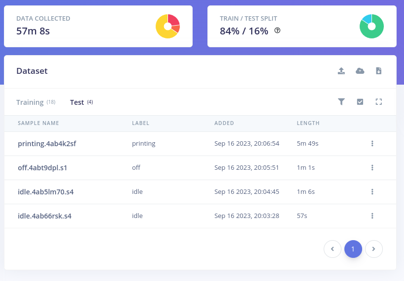 The collected samples were split into smaller chunks, and then arranged into Training and Test sets with close to 80/20 proportion: