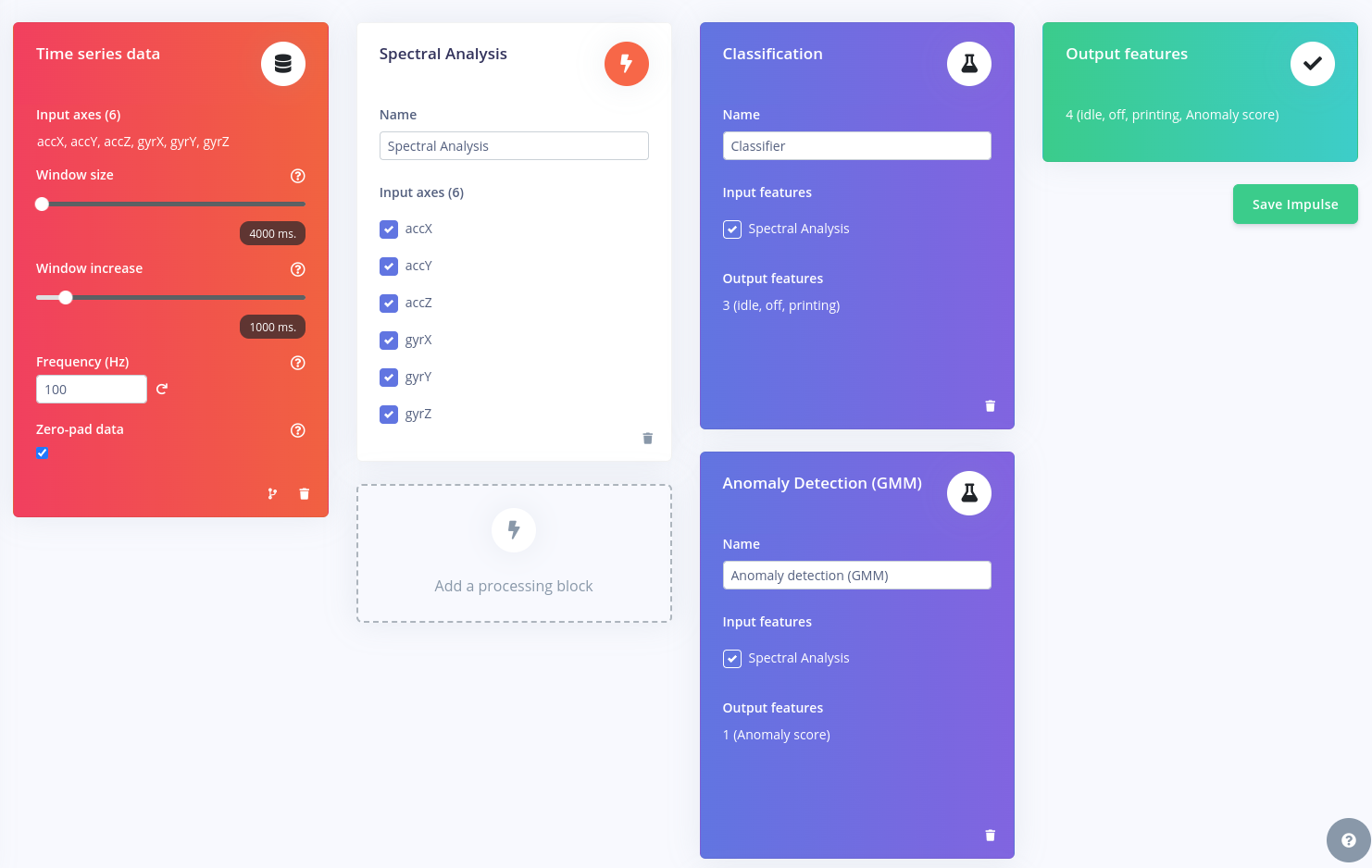 Now that we have some data, we can continue with the Impulse design step. The Impulse represents our machine learning pipeline, which includes data collection, pre-processing and learning stages. For this tutorial I went with the following blocks:- Time Series Data input