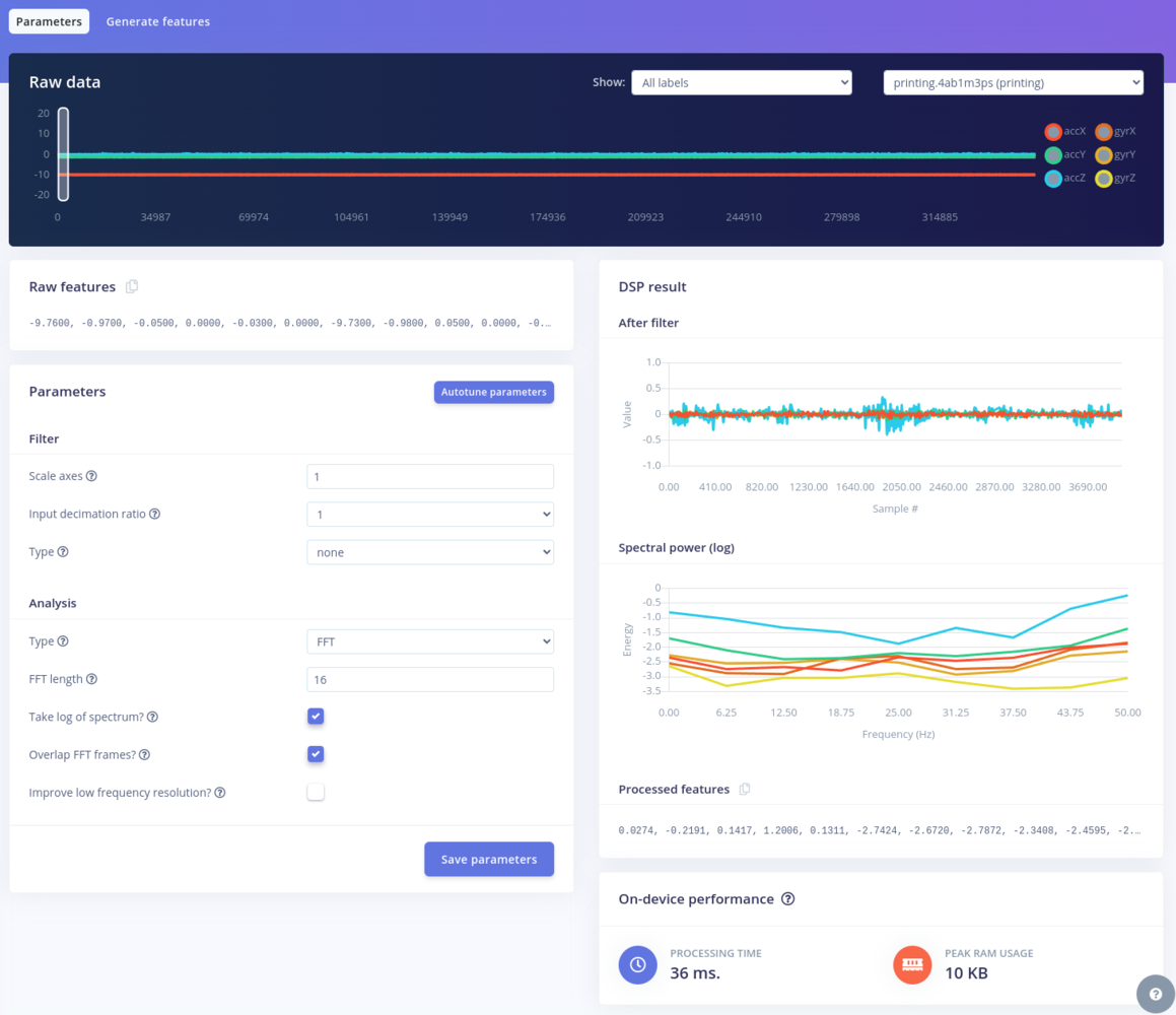 The Spectral Analysis processing block is used to extract frequency, power and other characteristics from the sensor data. It is ideal for detecting motion patterns in inertial sensor signals. In this project we are using it to process the accelerometer and gyroscope data. Setting up Spectral Analysis is fairly easy. In most of the cases we can rely on Edge Impulse Studio to chose the appropriate parameters by clicking the