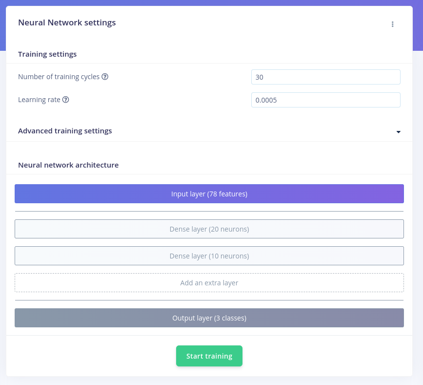 After the feature generation the next step is to generate a Classifier. Here we will train a Neural Network using the default settings, which consists of an Input layer, two Dense layers, and an Output layer: