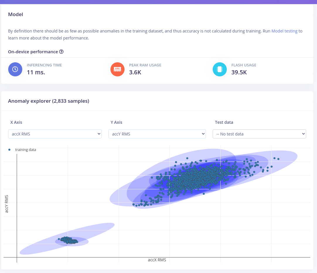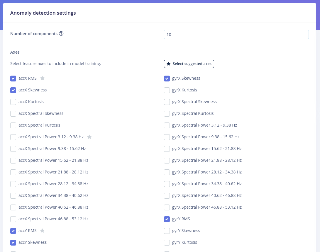 Anomaly detection can be used detect irregular patterns in the collected sensor data. In Edge Impulse we can implement anomaly detection using one of the two available anomaly detection blocks. For this project, I decided to go with the Anomaly Detection (GMM) learning block. In terms of parameters, we need to select a couple of spectral features we want to use for the anomaly detections. After a couple of tries, I went with 10 components with the RMS and Skewness values from the Accelerometer and Gyroscope sensors selected as features.
