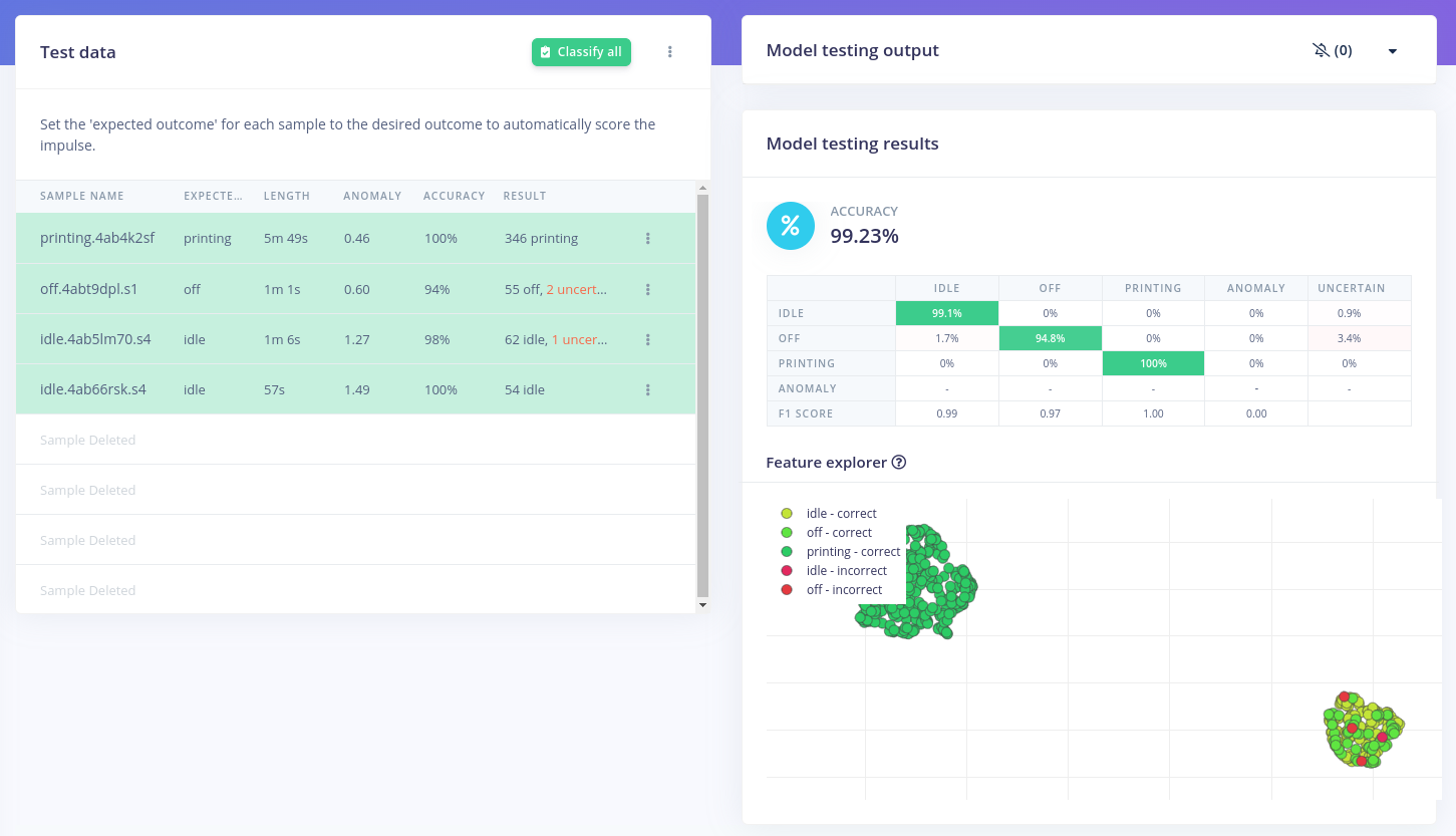 As our example shows, the BrickML is very capable device, that can be used to implement Edge ML solutions with very little development effort. Using BrickML and Edge Impulse Studio we can easily collect sensor data and train an ML model. The resulting model can be rapidly deployed to the BrickML device, which then runs the inference in real time. To integrate BrickML into an existing solution, we can use the AT interface it exposes, or we can also chose to the extend its firmware with custom functionality.Resources