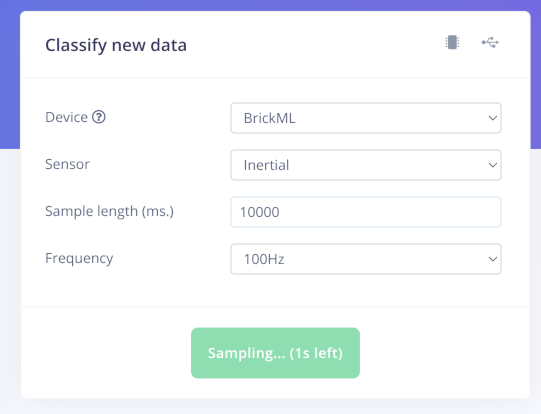 As the model works as expected, we should try Live classification on newly sampled data from the BrickML device. For this, first we need to connect to the BrickML device, either using edge-impulse-daemon or Web USB. After this, we can start collecting some sensor data, by hitting the “Start sampling” button with the appropriate parameters: