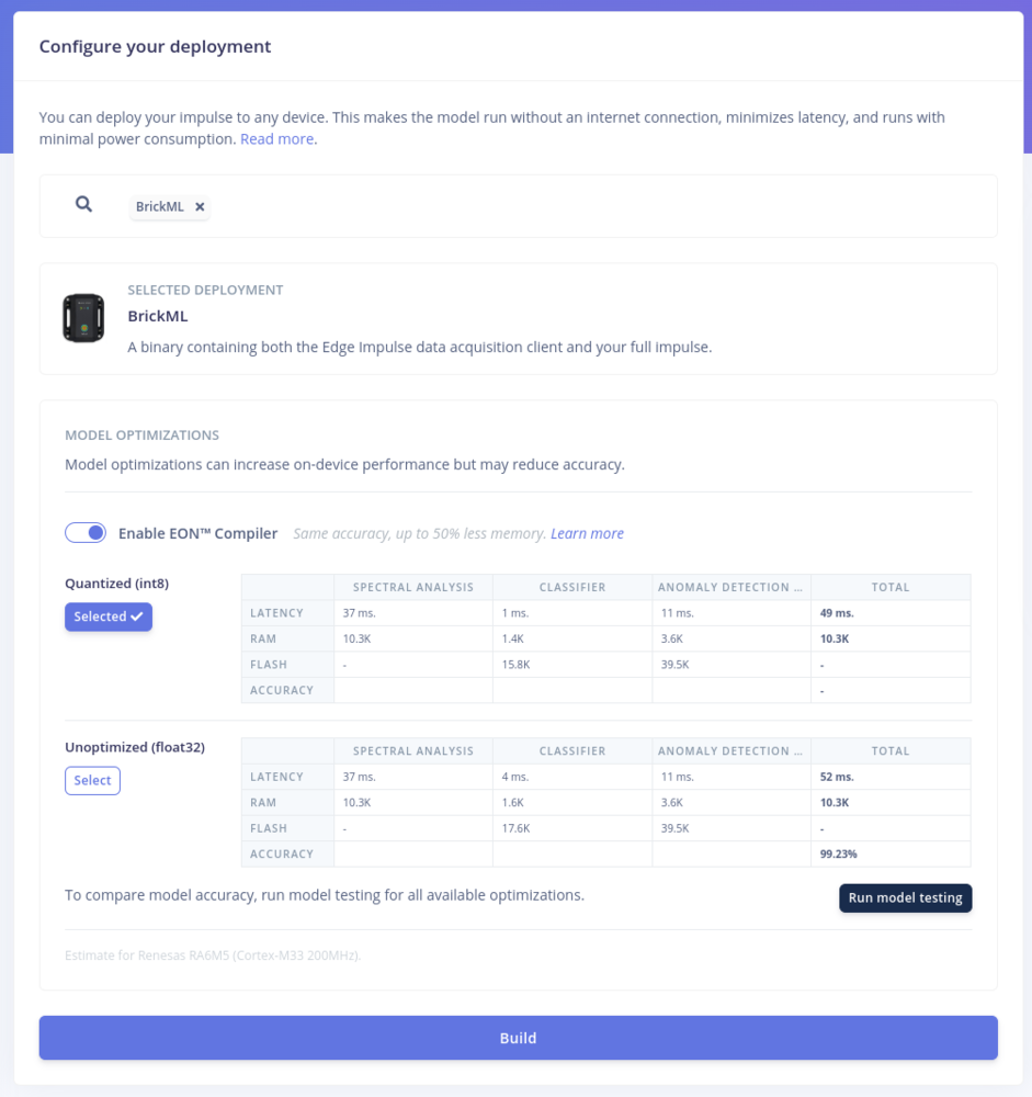 The final stage of the project is to build and deploy our Impulse to the BrickML device. To build the image we can go to the Deployment tab. There, we need to select the BrickML / Renesas RA6M5 (Cortex-M33 200MHz) as the target, and click the Build button: