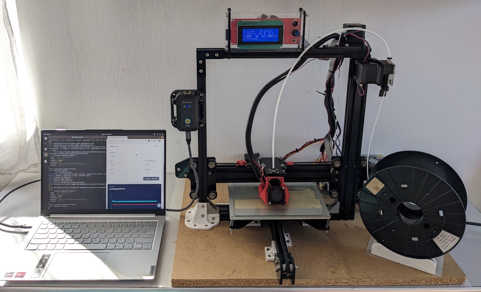 For the purpose of this tutorial, I choose to mount the BrickML on a 3D printer. The idea is use the BrickML for anomaly detection. For this, first we will teach the device how the 3D printer normally operates, after which we will build an anomaly detection model that can detect irregularities in the functioning of the 3D printer. Installing the BrickML to the 3D printer was fairly easy. The BrickML comes in a case with four mounting holes that can be used to mount the device on various equipment. In the case of the 3D printer, I mounted the BrickML to the frame using some M4 bolts and T-nuts.