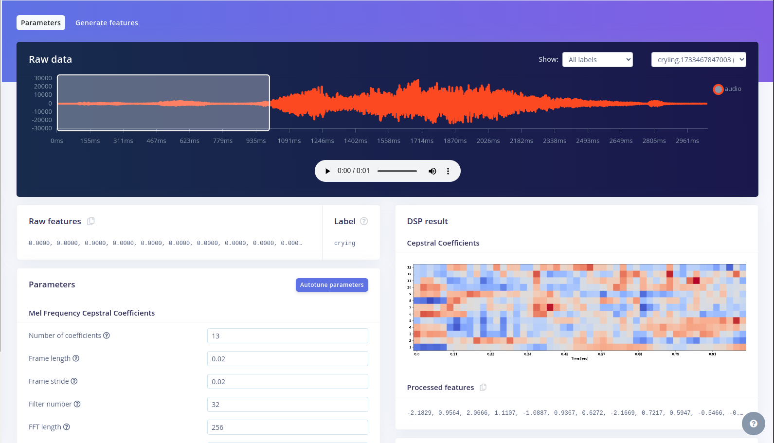 - Click Generate Features to process all audio windows into spectrograms.