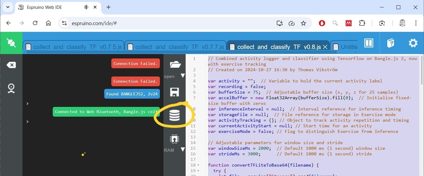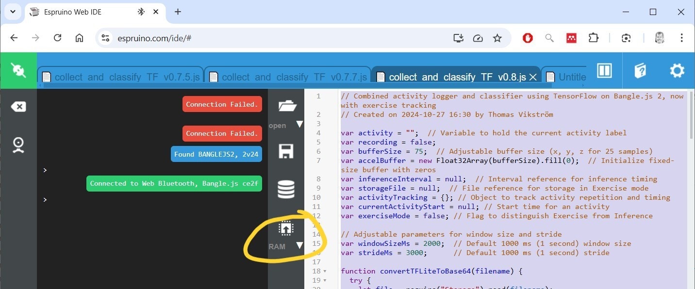 Now it’s time to test the model in real life! Here you’ll use the same program as earlier in Software Configuration, so unless the app is still running on your Bangle, just upload it to RAM once again.- When you want to test the app without storing any activity data, just select