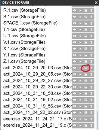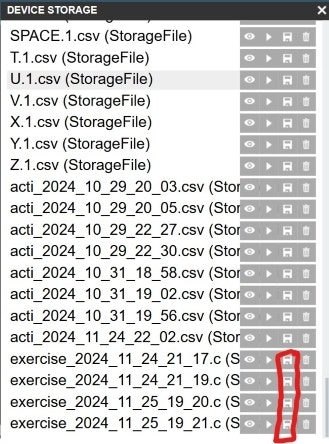 Access the Storage again from within Espruino IDE, and download the exercise files (namedexercise + timestamp when file created)