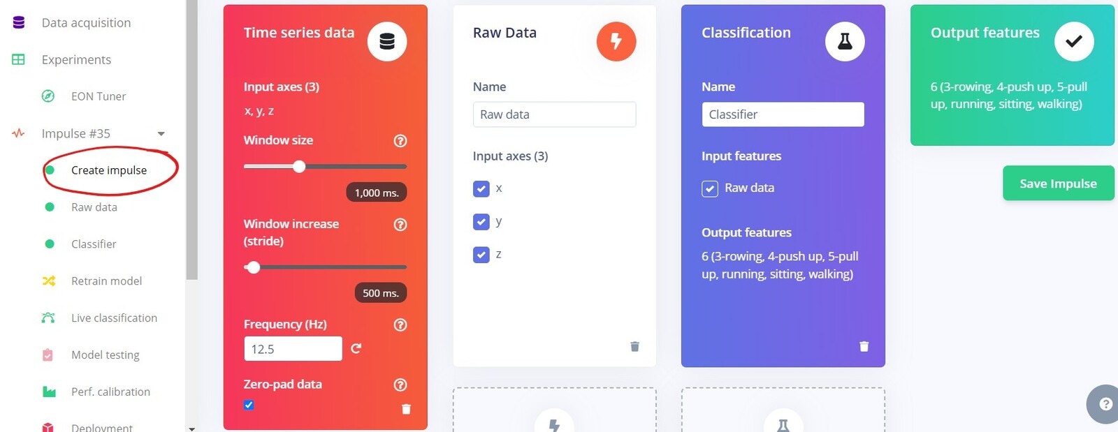 In Edge Impulse, navigate toCreate impulse and configure the following settings: