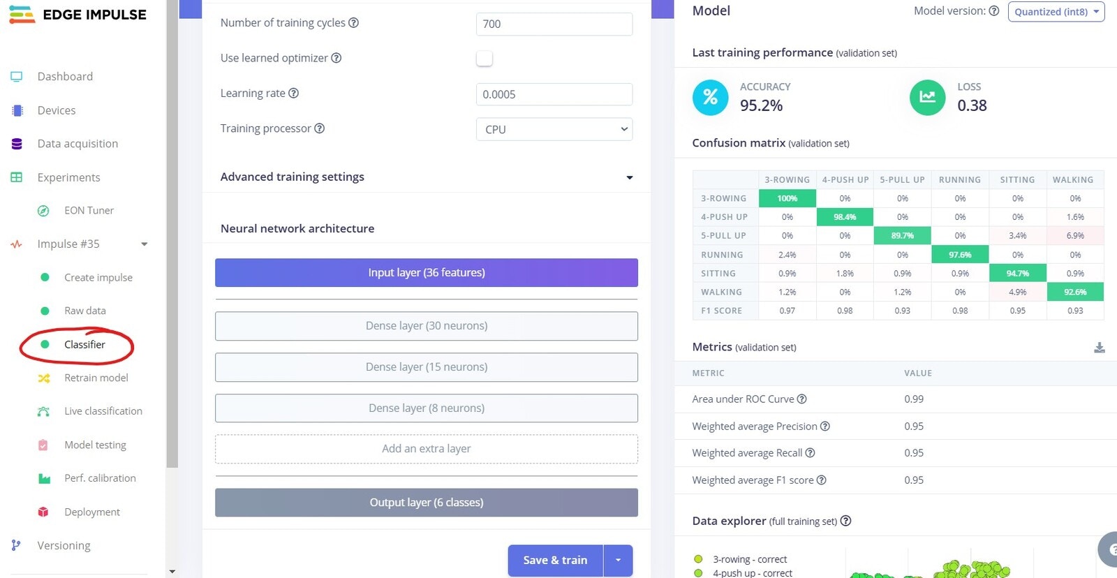 Save & trainto start training - My results were fairly good with an accuracy of 95%, but to improve the model even further, I’d collect more data.