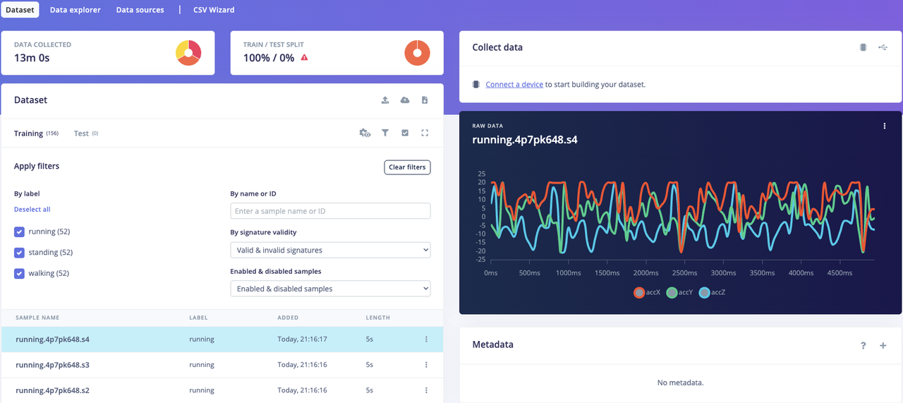 The Thingy:53 was used for collecting a dataset for training the AI model to establish a baseline of normal, healthy gait patterns. This dataset includes three types of movement: standing, walking, and running. To capture realistic data, the user wore the device while performing these activities. The dataset’s variety helps the model accurately classify different gait patterns and detect potential abnormalities in various situations.