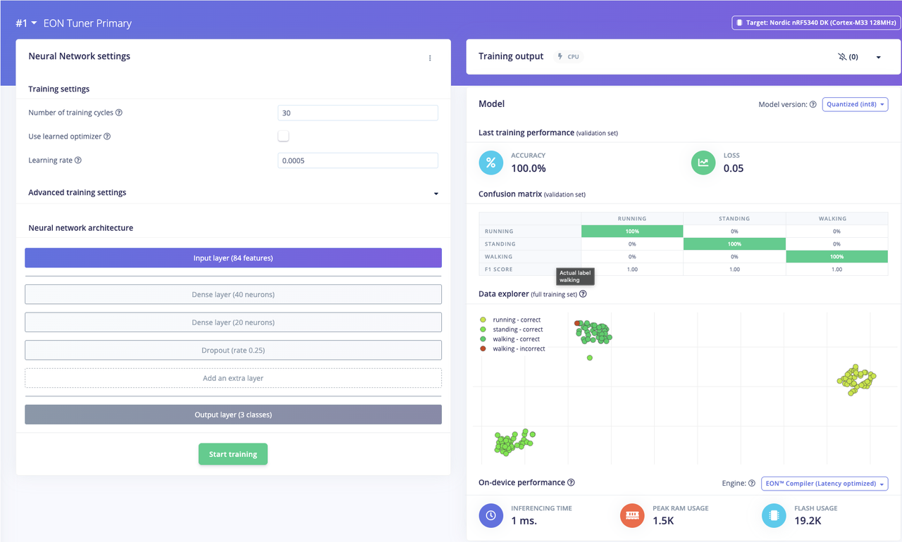 The Nordic Thingy:53 leverages the nRF5340 Arm Cortex-M33 SoC, providing the computational resources necessary for on-device AI inference. It also includes a built-in accelerometer to capture detailed gait data and Bluetooth 5.4 for wireless communication. Importantly, the same nRF5340 chip powers the nRF5340 Development Kit, providing a consistent hardware platform throughout the project’s development cycle. This means we can easily prototype on the Thingy:53, refine algorithms and sensor selections on the Development Kit, and ultimately transition to a custom wearable design for mass production – all using the same core chip. This approach ensures a smooth and efficient development process.