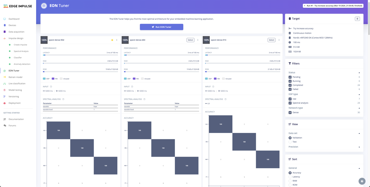 Now the AI model is ready to be deployed to the Edge. Nordic Thingy:53 is selected for our deployment option. For this project we chose unoptimized (float32) to preserve accuracy since our hardware has enough performance and memory headroom.