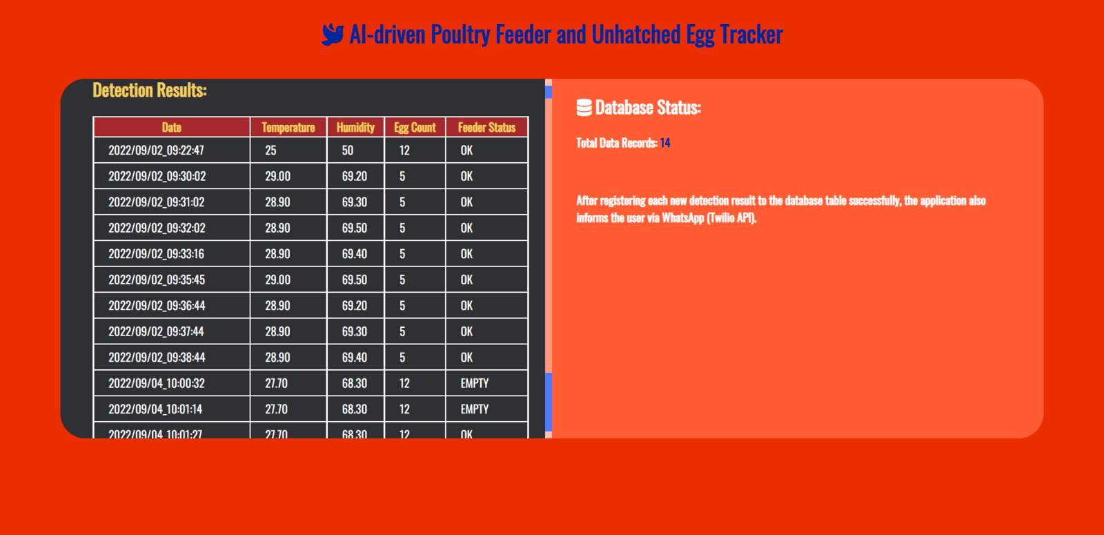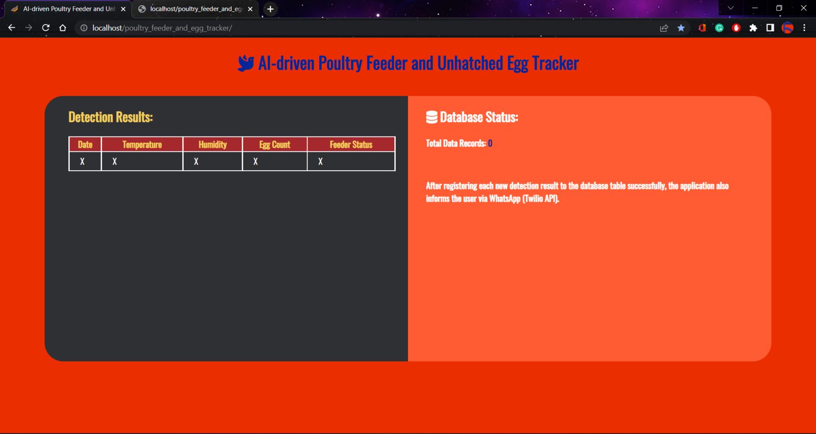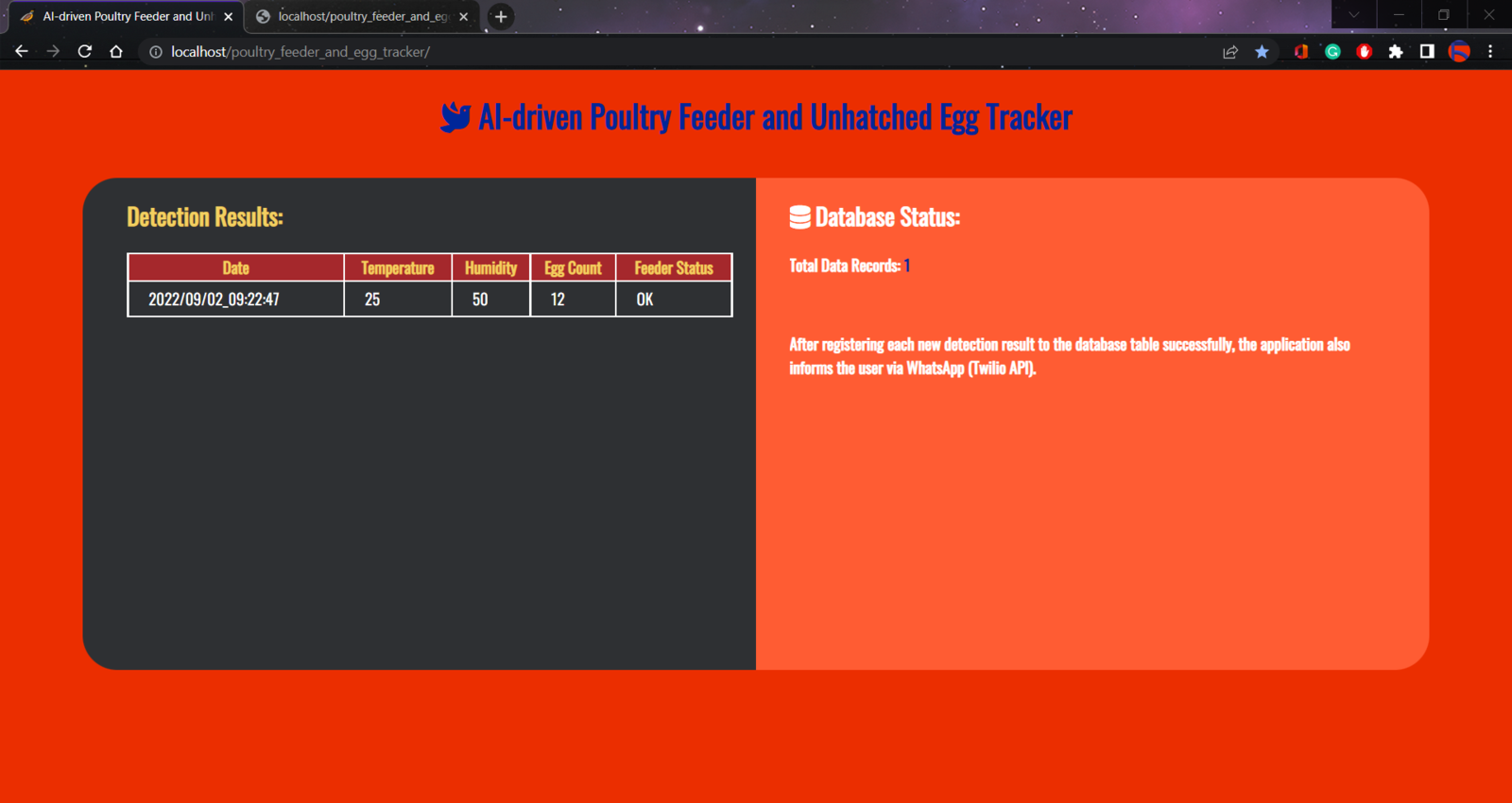 After running the Poultry_Feeder_and_Unhatched_Egg_Tracker.ino file on WizFi360-EVB-Pico: 🐤🥚 The device transmits the detection results and the collected weather data to the PHP web application when WizFi360-EVB-Pico receives the detection results from OpenMV Cam H7 via serial communication every half an hour. 🐤🥚 As explained in Step 3, when the web application obtains the detection results and the collected weather data via an HTTP GET request, the application appends the current date & time and logs the received data to the given MySQL database table. 🐤🥚 Then, the application shows all registered data records as a list on the home page.