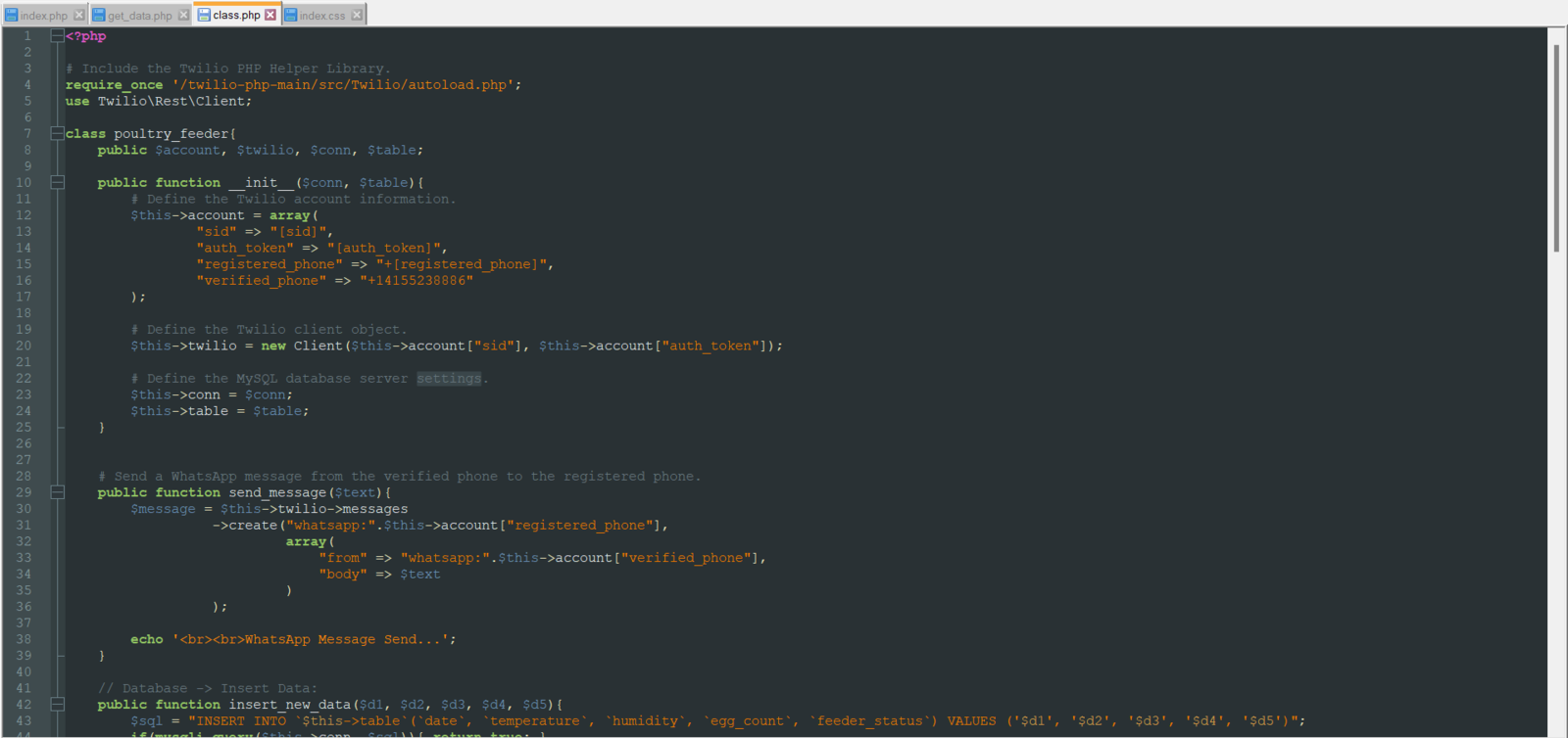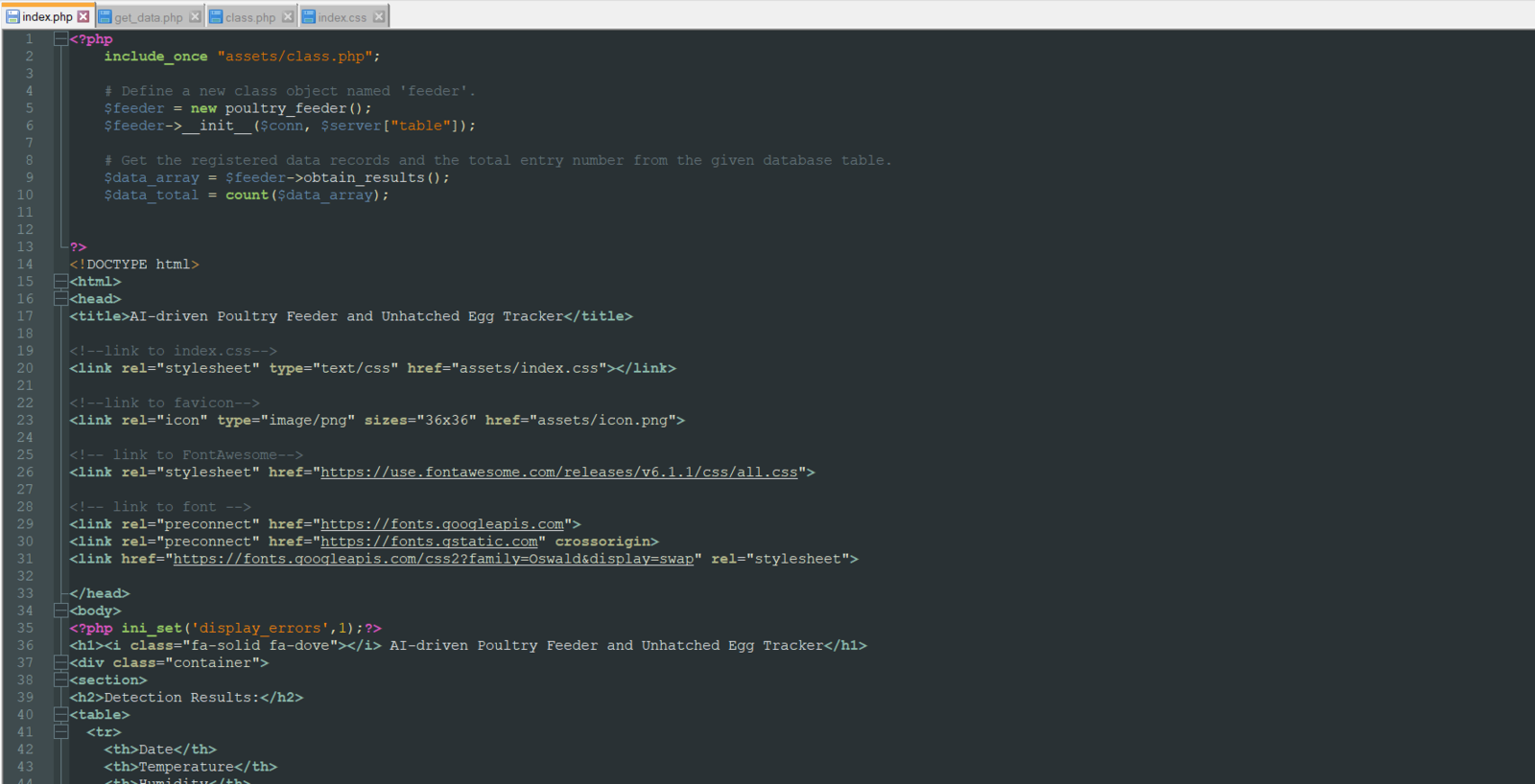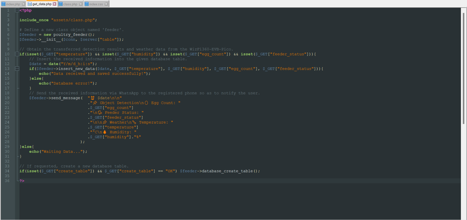 To be able to log the detection results with the collected weather data transmitted by WizFi360-EVB-Pico and send WhatsApp messages via the Twilio PHP Helper Library to inform the user of the detection results, I decided to develop a web application in PHP named poultry_feeder_and_egg_tracker. As shown below, the web application consists of one folder and five files:- /assets