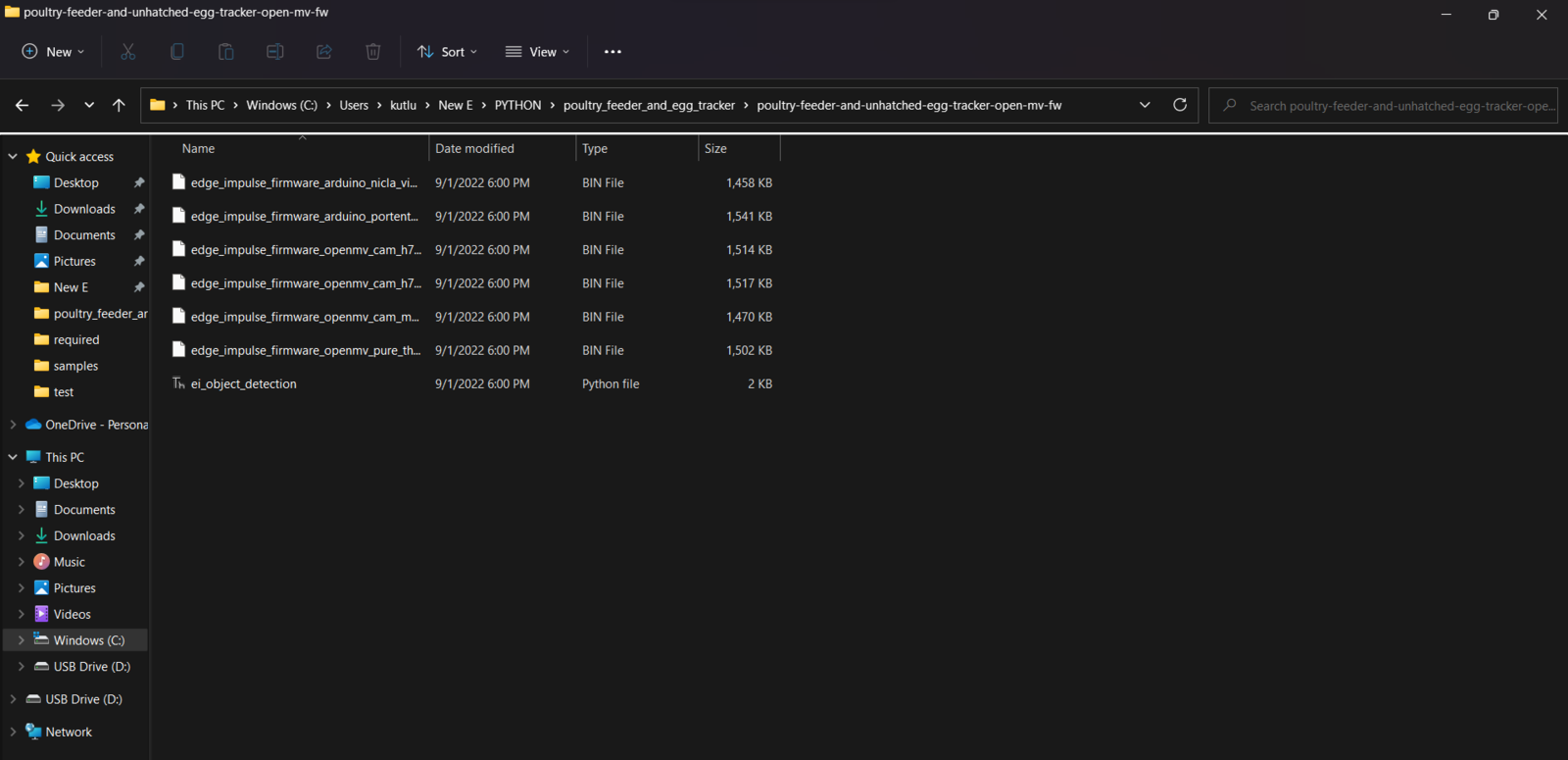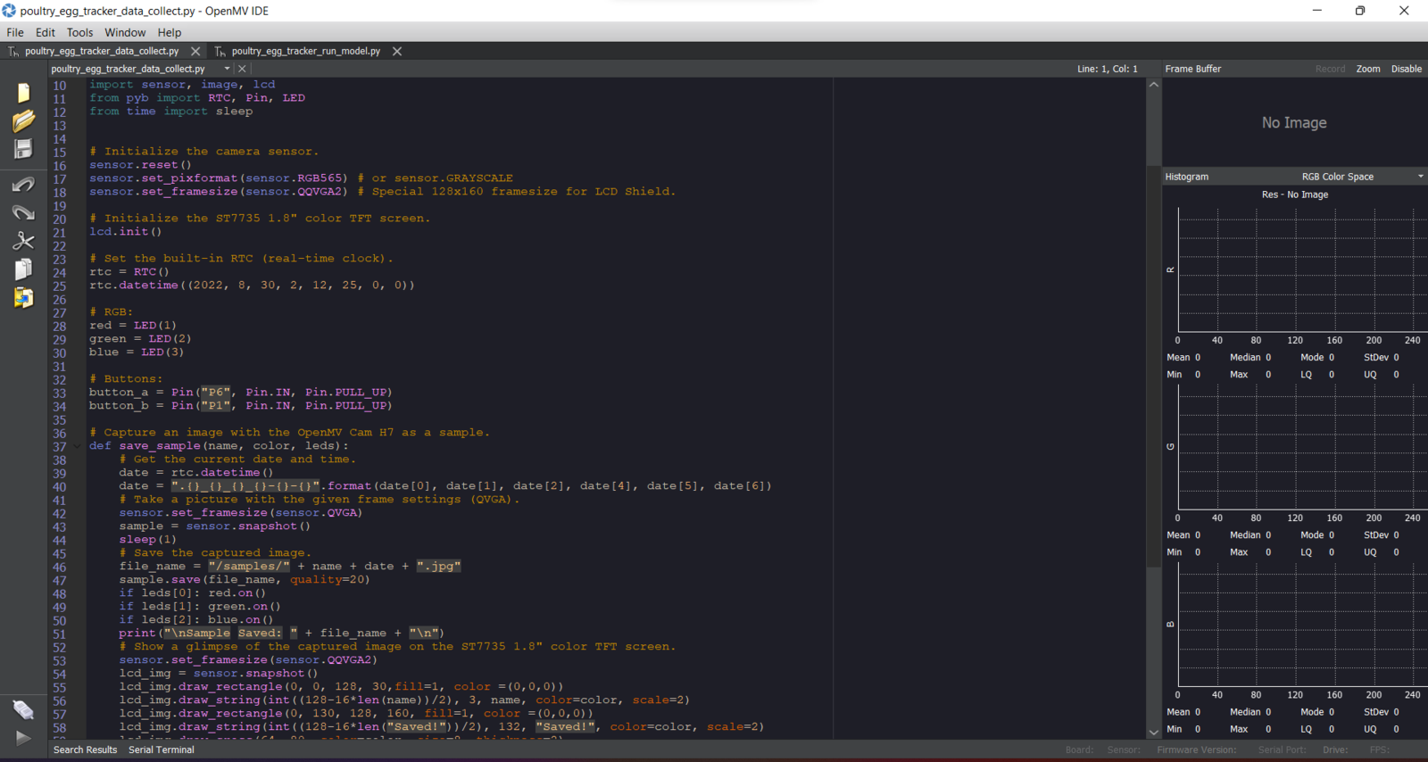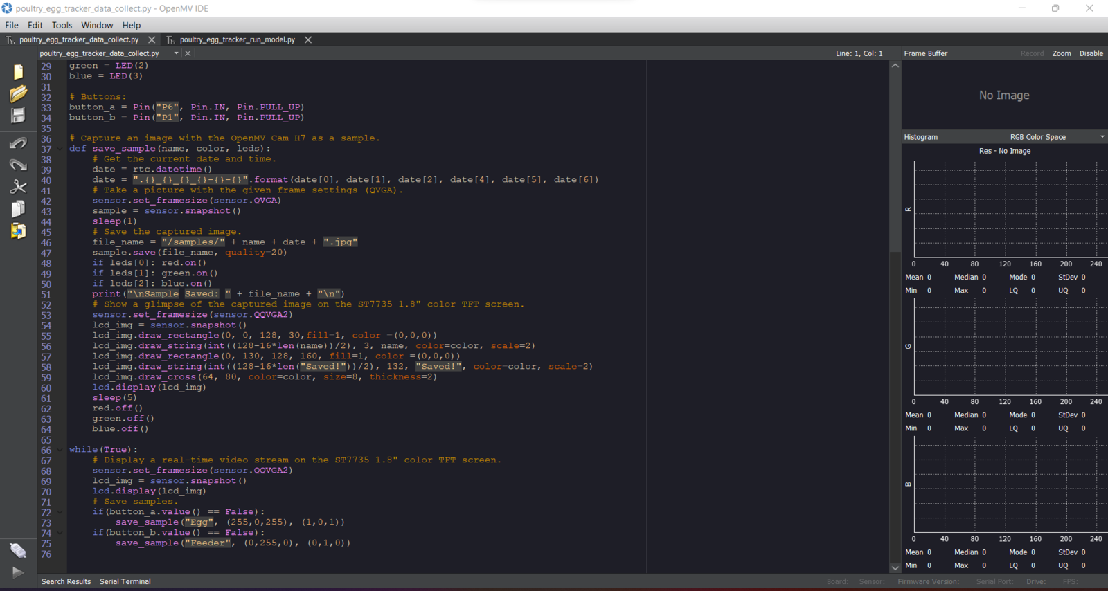 Before proceeding with the following steps, I needed to install the OpenMV IDE in order to program OpenMV Cam H7. Plausibly, the OpenMV IDE includes all required libraries and modules for this project. Therefore, I did not need to download additional modules after installing the OpenMV IDE from here. You can get more information regarding the specific OpenMV MicroPython libraries from here. After setting up OpenMV Cam H7 on the OpenMV IDE, I programmed OpenMV Cam H7 to capture coop images showing the produced eggs and the poultry feeder in order to store them on the SD card and create appropriately labeled samples for the Edge Impulse object detection (FOMO) model. Since I needed to assign labels for each captured coop image to create a valid data set for the object detection model, I utilized the control buttons attached to OpenMV Cam H7 so as to choose among two different classes. After selecting a class, OpenMV Cam H7 captures a picture, appends the selected class name (Egg or Feeder) with the current date & time to the file name, and then saves the captured image to the SD card under the samples folder.- Control Button (A) ➡ Egg