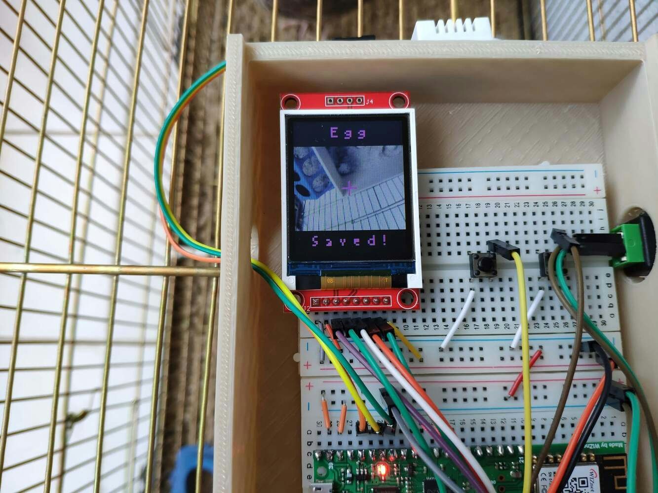 After uploading and running the code for capturing coop pictures and saving them to the SD card on OpenMV Cam H7: 🐤🥚 The device displays a real-time video stream on the ST7735 1.8” color TFT screen.