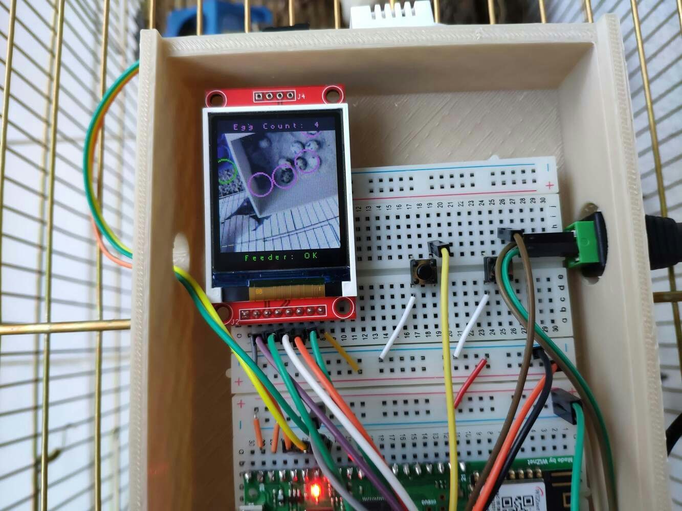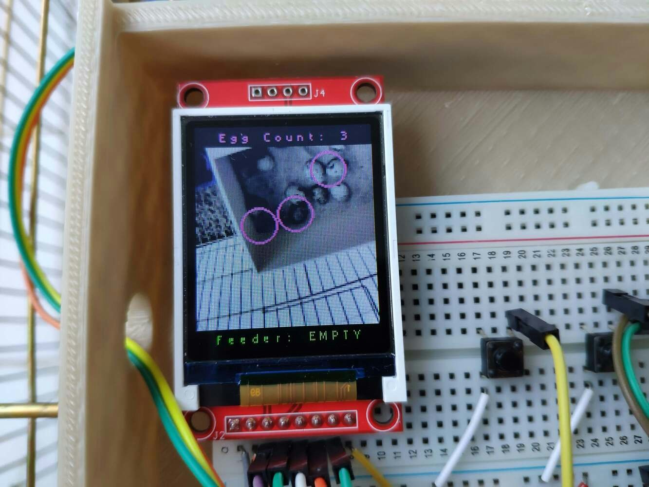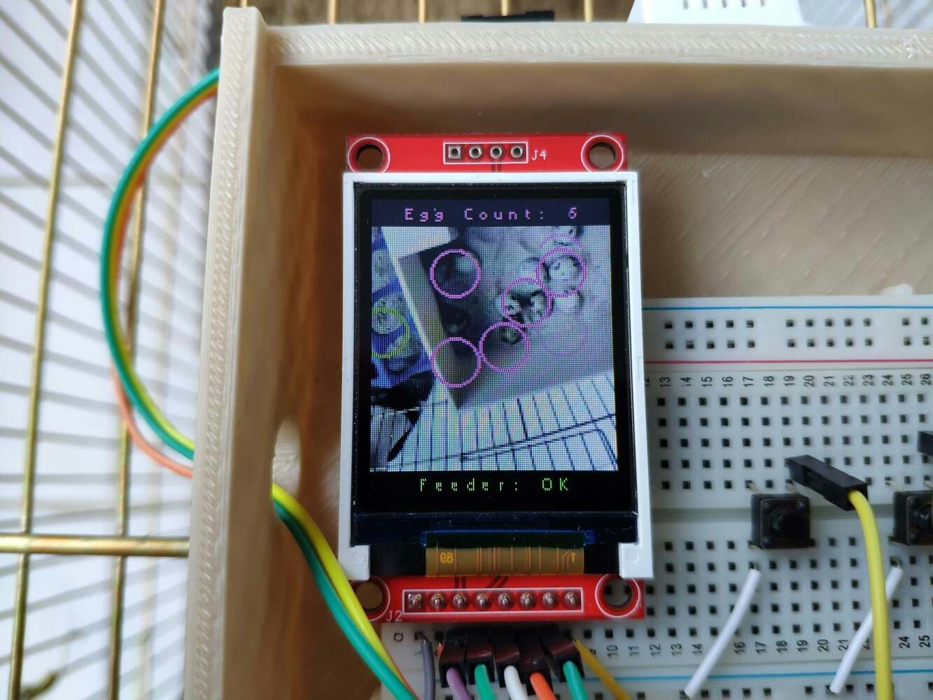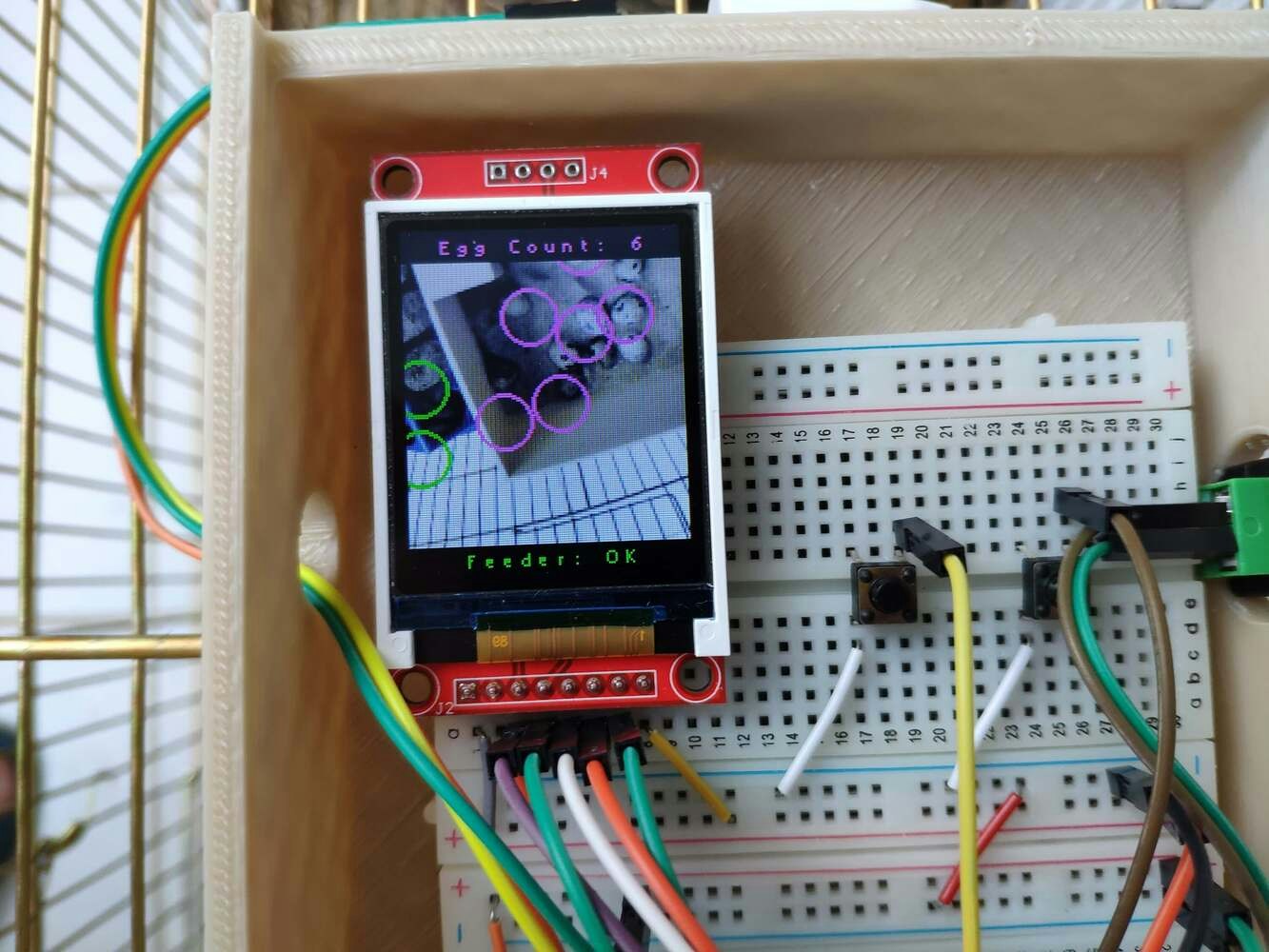 In poultry reproductive flocks, it is essential to achieve a large number of eggs with solid structure, optimal morphological composition, and interior quality. Also, these traits have a significant impact on the egg’s biological value determining the development stages of the embryo. However, the egg quality is determined based on many traits important for global egg production: and depends on many factors, including the diet, age of hens, and the feeding schedule. According to the latest experiments, the best performance by breeder hens is obtained by controlling their body weight by restricting their feed intake. A rationed feed is generally provided in a strict feeding schedule each morning and is expected to be consumed in about 4 hours. Since poultry eating habits and calcium consumption are related to their diurnal rhythm and time of ovulation to a lesser extent, it is crucial to follow a regular feeding schedule to maintain the high poultry health status and maximize egg quality[^1]. Even though there are various nutrition and management factors affecting egg production and quality, the feeding schedule proportional to cage density affects egg production considerably since hens can stop laying eggs intrinsically when they notice a sporadic feeding schedule or paltry feed. Hence, applying a regular and nutritional feeding regimen helps hens lay eggs abundantly. Furthermore, as the hen’s age increases, the weight of the produced egg usually increases, and the weekly produced egg number decreases. Although each hen has an inveterate laying time, the weekly produced egg number denotes the overall health condition of the hens in the coop. Therefore, tracking unhatched eggs and logging the daily produced egg number assist farmers in determining a potential contagious poultry disease or malnutrition. However, these processes can be compelling and arduous for small businesses in the poultry industry or people raising domesticated birds in their houses or backyards to produce eggs for profit. Since I am also raising quails as pets on my balcony, I am well aware of the struggles with tracking the poultry feeder status and the produced egg number daily. Hence, I decided to create this budget-friendly and accessible device to track the poultry feeder status and the produced egg number automatically with object detection. To recognize eggs in the coop (cage) and track the poultry feeder status accurately, I needed to collect data from the coop in order to train my object detection model with notable validity. Since OpenMV Cam H7 is a considerably small high-performance microcontroller board designed for machine vision applications in the real world, I decided to utilize OpenMV Cam H7 in this project. Also, I could easily capture images of my coop and store them on an SD card since OpenMV Cam H7 has a built-in MicroSD card module. Then, I employed a color TFT screen (ST7735) to display a real-time video stream and the prediction (detection) results. After completing my data set by taking pictures of the produced eggs and the poultry feeder in my quail coop, I built my object detection model with Edge Impulse to recognize (count) the produced eggs and track the poultry feeder status: OK or EMPTY. I utilized Edge Impulse FOMO (Faster Objects, More Objects) algorithm to train my model, which is a novel machine learning algorithm that brings object detection to highly constrained devices. Since Edge Impulse is nearly compatible with all microcontrollers and development boards, I had not encountered any issues while uploading and running my model on OpenMV Cam H7. As labels, I appended two main classes to the file names while capturing and storing pictures:- Egg
