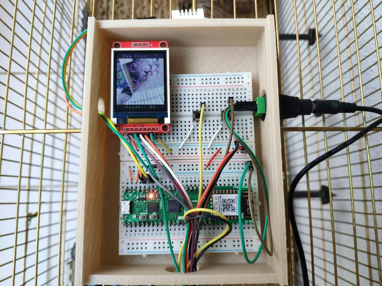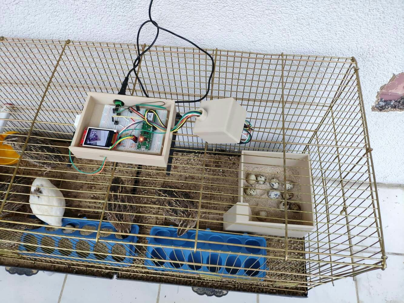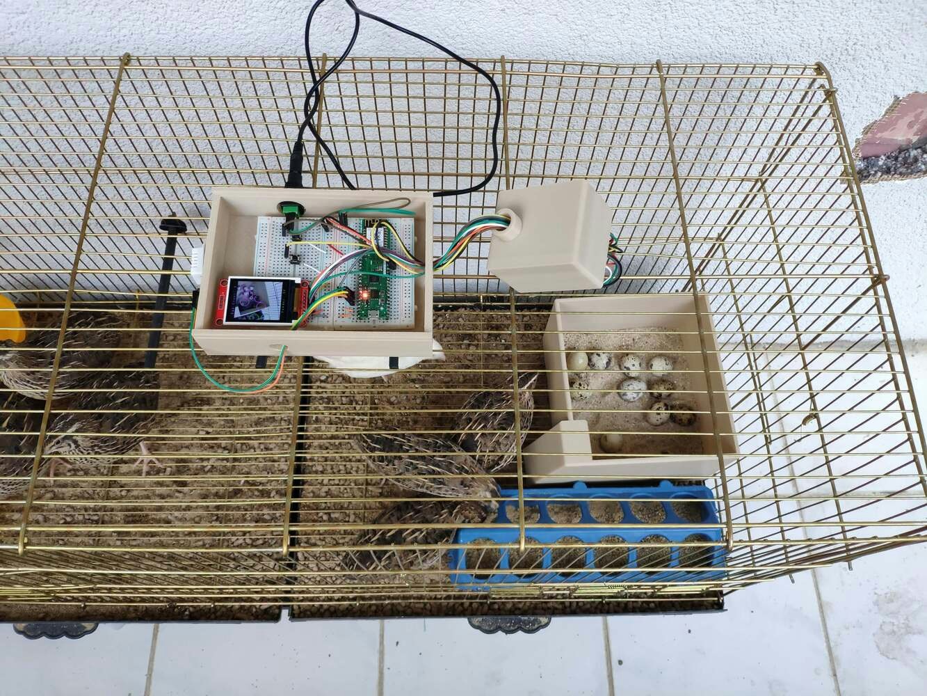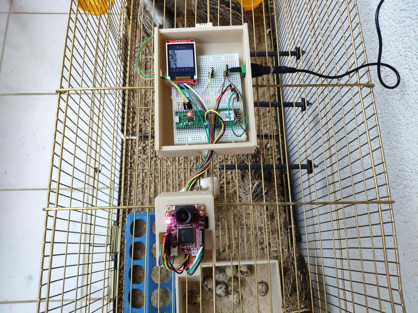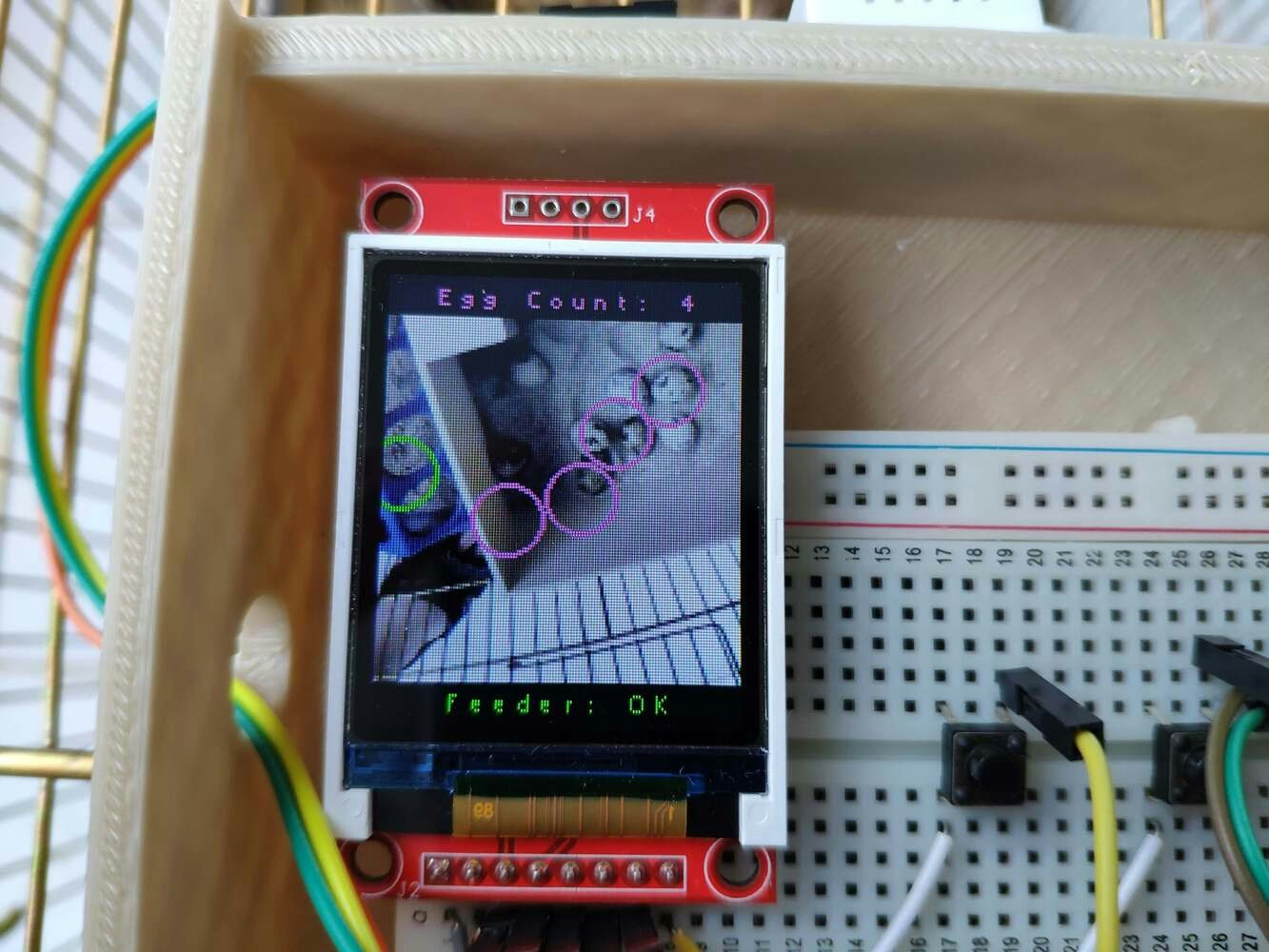 In poultry reproductive flocks, it is essential to achieve a large number of eggs with solid structure, optimal morphological composition, and interior quality. Also, these traits have a significant impact on the egg’s biological value determining the development stages of the embryo. However, the egg quality is determined based on many traits important for global egg production: and depends on many factors, including the diet, age of hens, and the feeding schedule. According to the latest experiments, the best performance by breeder hens is obtained by controlling their body weight by restricting their feed intake. A rationed feed is generally provided in a strict feeding schedule each morning and is expected to be consumed in about 4 hours. Since poultry eating habits and calcium consumption are related to their diurnal rhythm and time of ovulation to a lesser extent, it is crucial to follow a regular feeding schedule to maintain the high poultry health status and maximize egg quality[^1]. Even though there are various nutrition and management factors affecting egg production and quality, the feeding schedule proportional to cage density affects egg production considerably since hens can stop laying eggs intrinsically when they notice a sporadic feeding schedule or paltry feed. Hence, applying a regular and nutritional feeding regimen helps hens lay eggs abundantly. Furthermore, as the hen’s age increases, the weight of the produced egg usually increases, and the weekly produced egg number decreases. Although each hen has an inveterate laying time, the weekly produced egg number denotes the overall health condition of the hens in the coop. Therefore, tracking unhatched eggs and logging the daily produced egg number assist farmers in determining a potential contagious poultry disease or malnutrition. However, these processes can be compelling and arduous for small businesses in the poultry industry or people raising domesticated birds in their houses or backyards to produce eggs for profit. Since I am also raising quails as pets on my balcony, I am well aware of the struggles with tracking the poultry feeder status and the produced egg number daily. Hence, I decided to create this budget-friendly and accessible device to track the poultry feeder status and the produced egg number automatically with object detection. To recognize eggs in the coop (cage) and track the poultry feeder status accurately, I needed to collect data from the coop in order to train my object detection model with notable validity. Since OpenMV Cam H7 is a considerably small high-performance microcontroller board designed for machine vision applications in the real world, I decided to utilize OpenMV Cam H7 in this project. Also, I could easily capture images of my coop and store them on an SD card since OpenMV Cam H7 has a built-in MicroSD card module. Then, I employed a color TFT screen (ST7735) to display a real-time video stream and the prediction (detection) results. After completing my data set by taking pictures of the produced eggs and the poultry feeder in my quail coop, I built my object detection model with Edge Impulse to recognize (count) the produced eggs and track the poultry feeder status: OK or EMPTY. I utilized Edge Impulse FOMO (Faster Objects, More Objects) algorithm to train my model, which is a novel machine learning algorithm that brings object detection to highly constrained devices. Since Edge Impulse is nearly compatible with all microcontrollers and development boards, I had not encountered any issues while uploading and running my model on OpenMV Cam H7. As labels, I appended two main classes to the file names while capturing and storing pictures:- Egg