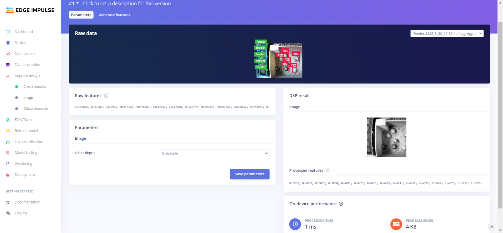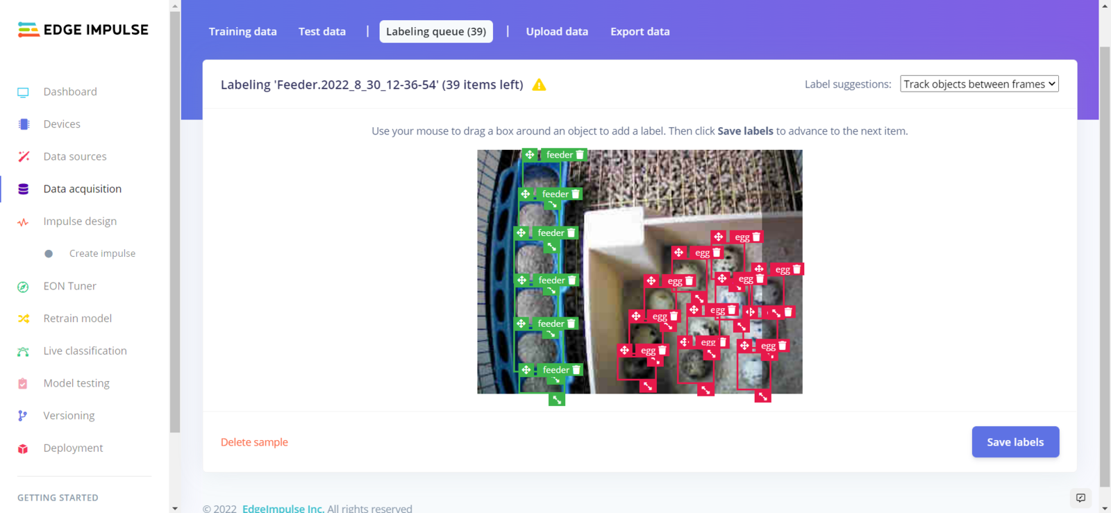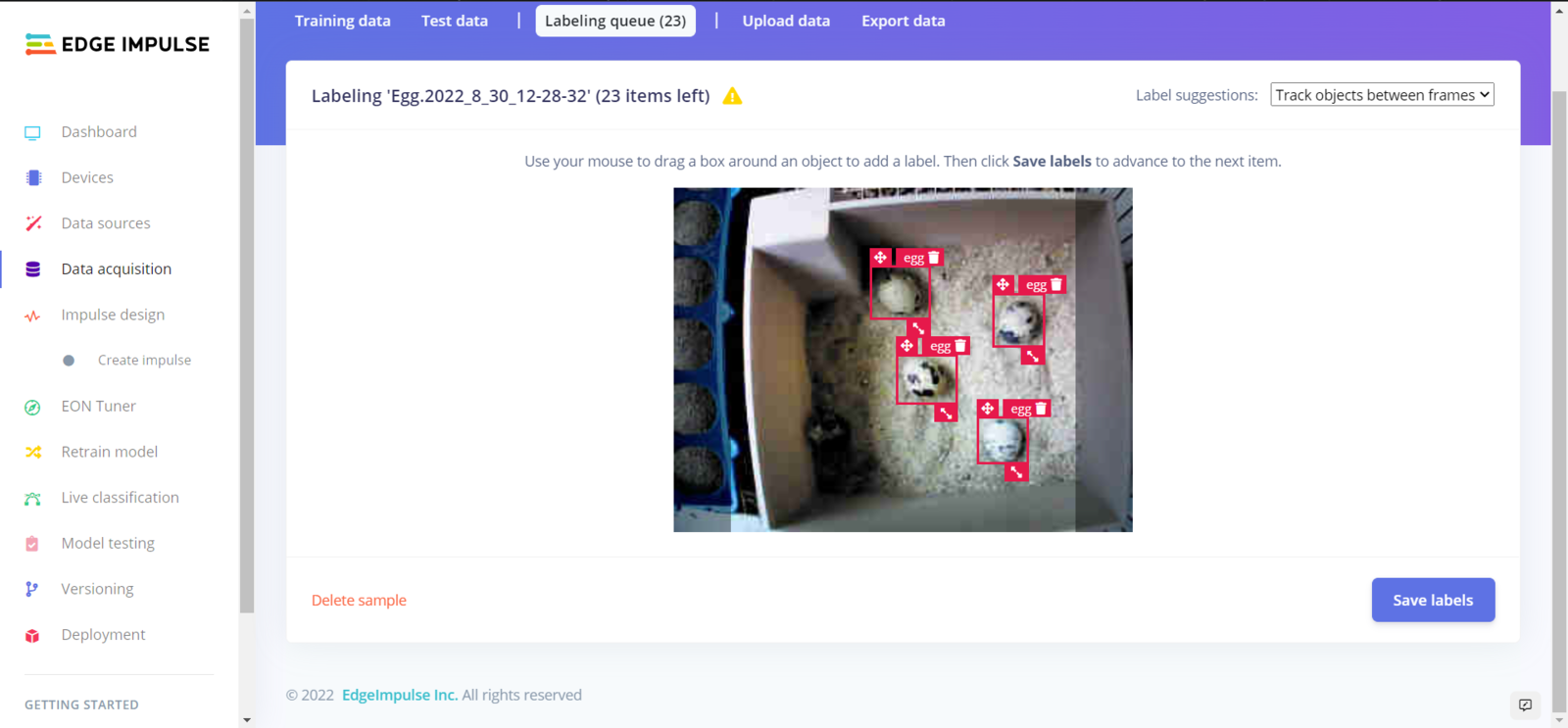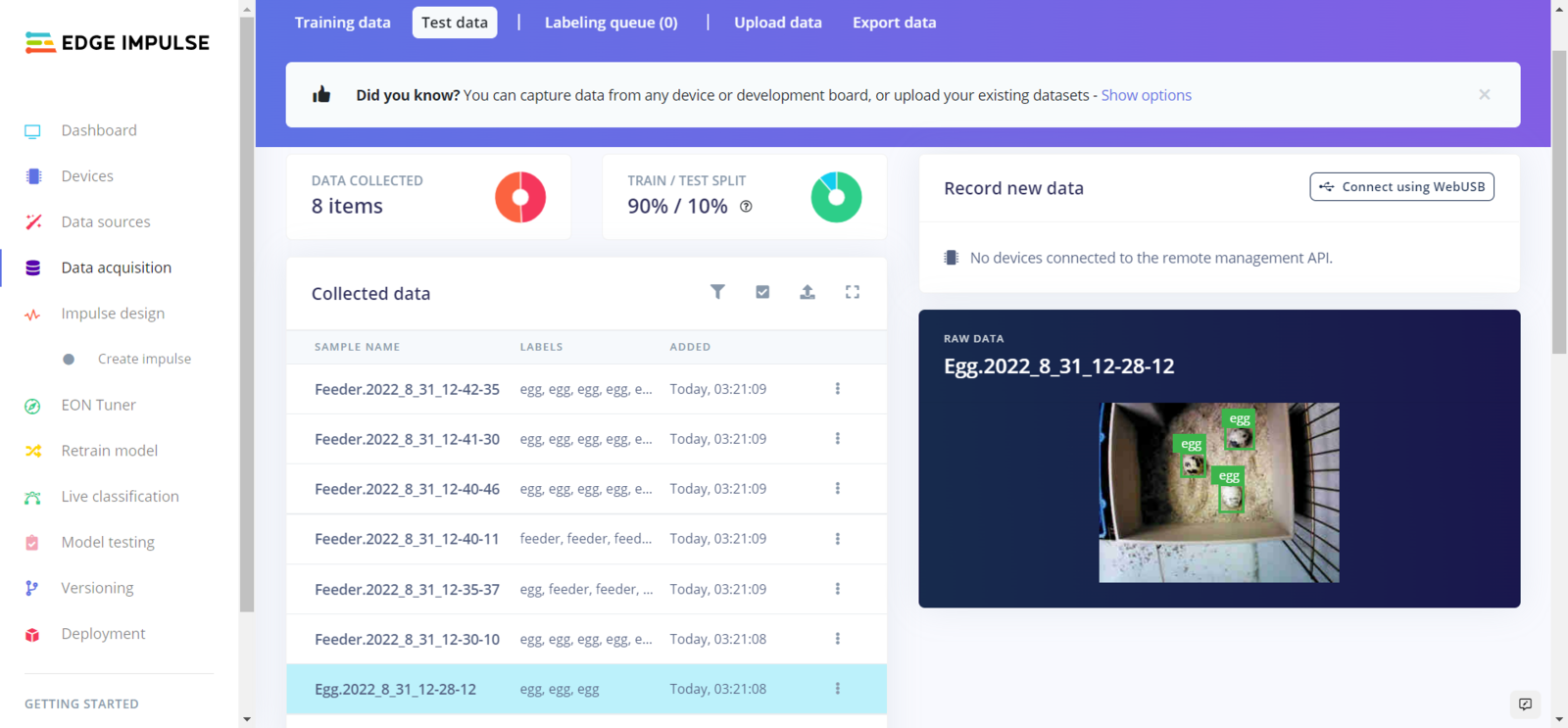 After collecting training and testing image samples, I uploaded them to my project on Edge Impulse. Then, I labeled the filled poultry feeder and the daily produced eggs on each sample with egg and feeder classes. Since I have a plastic ground poultry feeder in my quail cage, I decided to train my object detection model on recognizing the filled feeding holes. If the model cannot detect any feeding holes, which means that the poultry feeder needs to be refilled. :hash: First of all, sign up for Edge Impulse and create a new project.