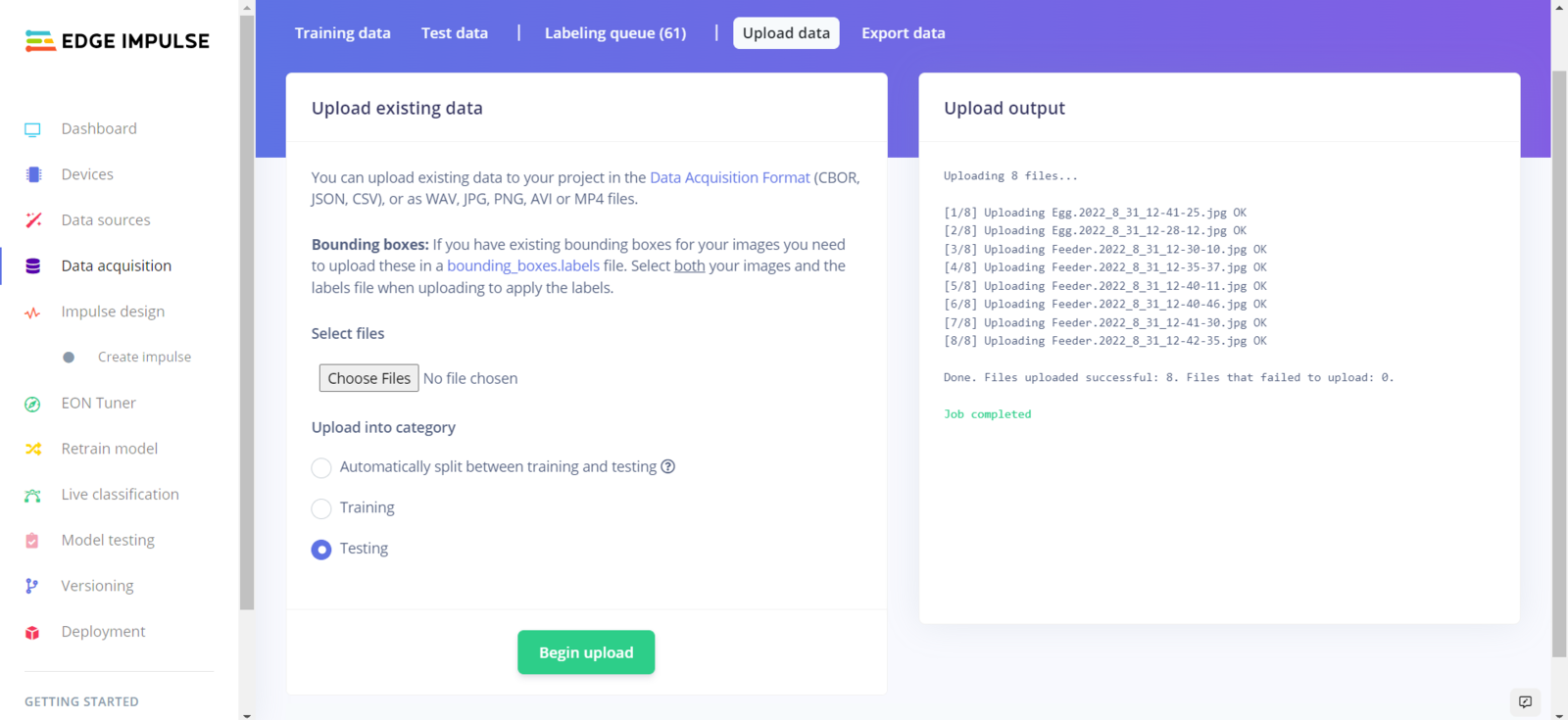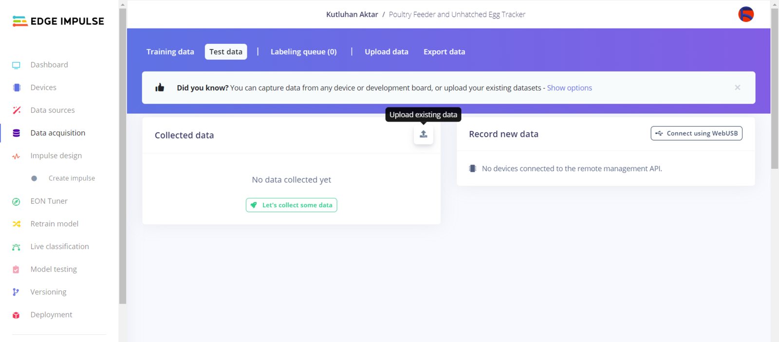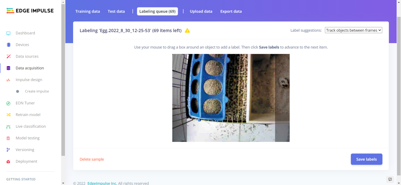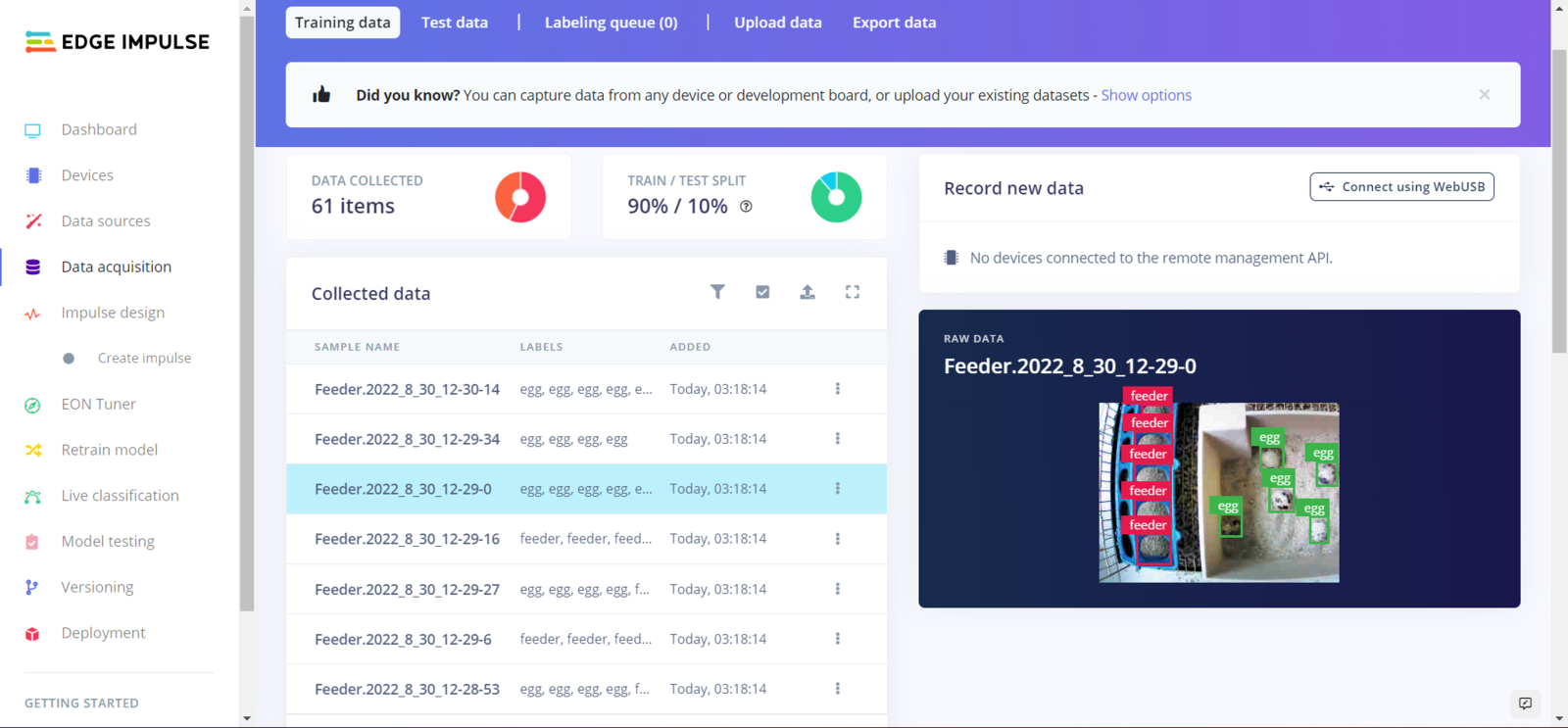 After collecting training and testing image samples, I uploaded them to my project on Edge Impulse. Then, I labeled the filled poultry feeder and the daily produced eggs on each sample with egg and feeder classes. Since I have a plastic ground poultry feeder in my quail cage, I decided to train my object detection model on recognizing the filled feeding holes. If the model cannot detect any feeding holes, which means that the poultry feeder needs to be refilled. :hash: First of all, sign up for Edge Impulse and create a new project.