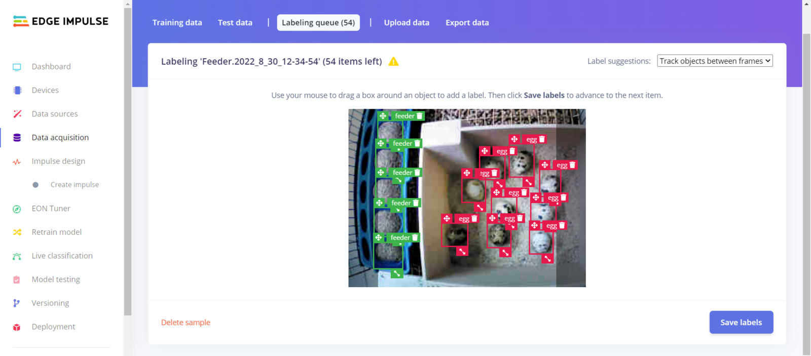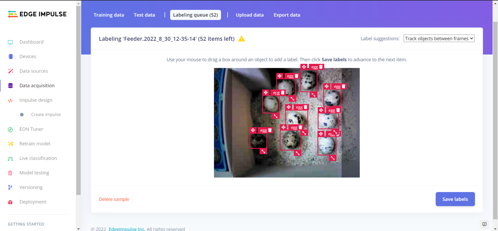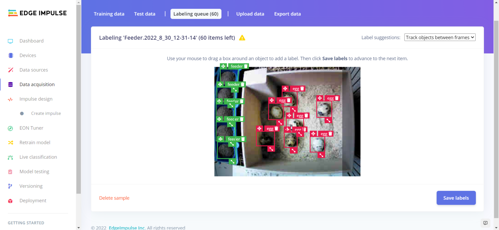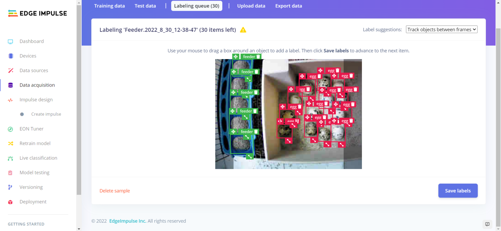 After collecting training and testing image samples, I uploaded them to my project on Edge Impulse. Then, I labeled the filled poultry feeder and the daily produced eggs on each sample with egg and feeder classes. Since I have a plastic ground poultry feeder in my quail cage, I decided to train my object detection model on recognizing the filled feeding holes. If the model cannot detect any feeding holes, which means that the poultry feeder needs to be refilled. :hash: First of all, sign up for Edge Impulse and create a new project.