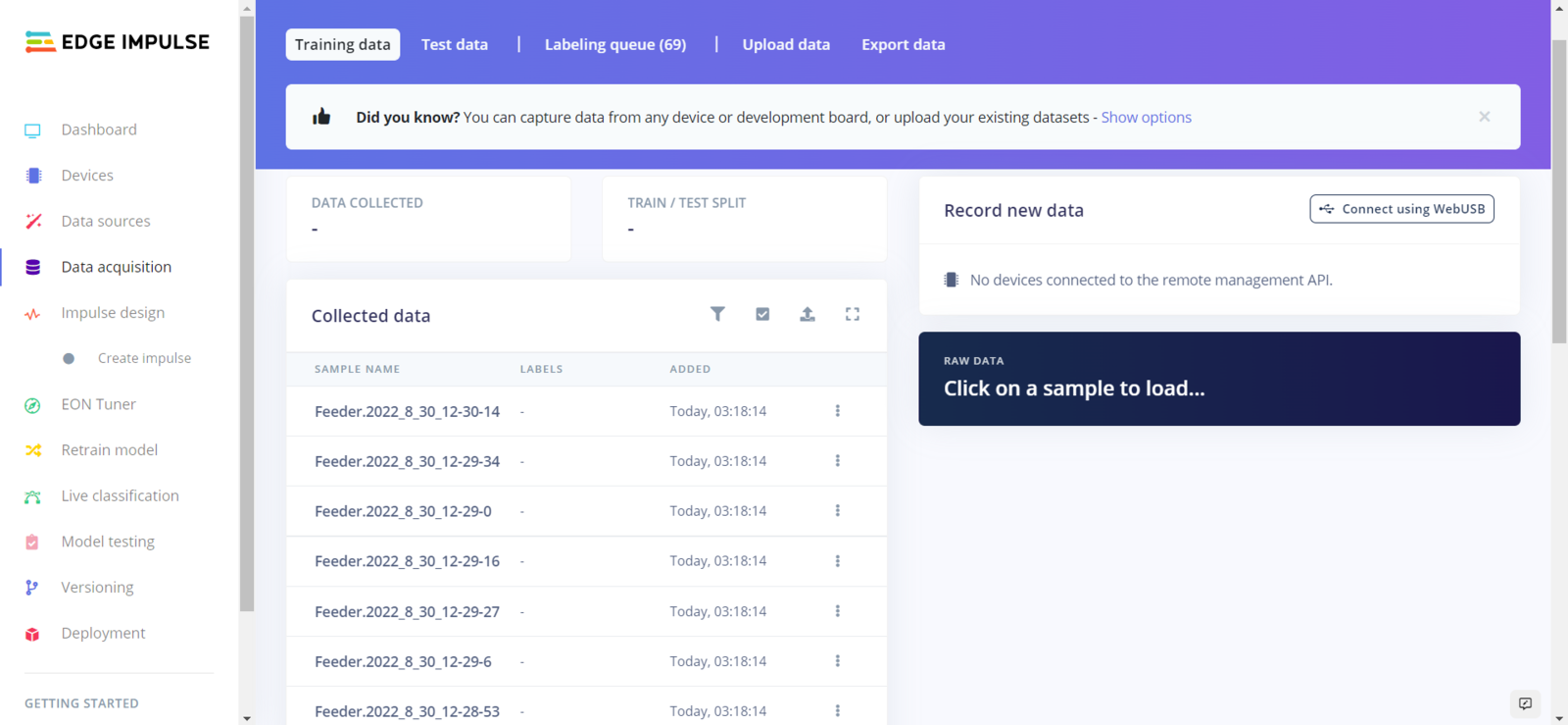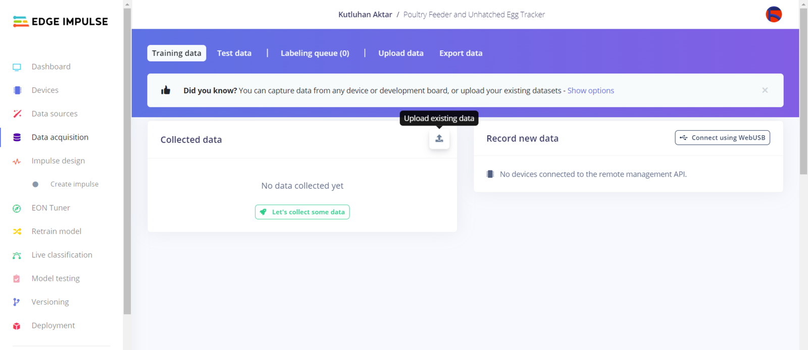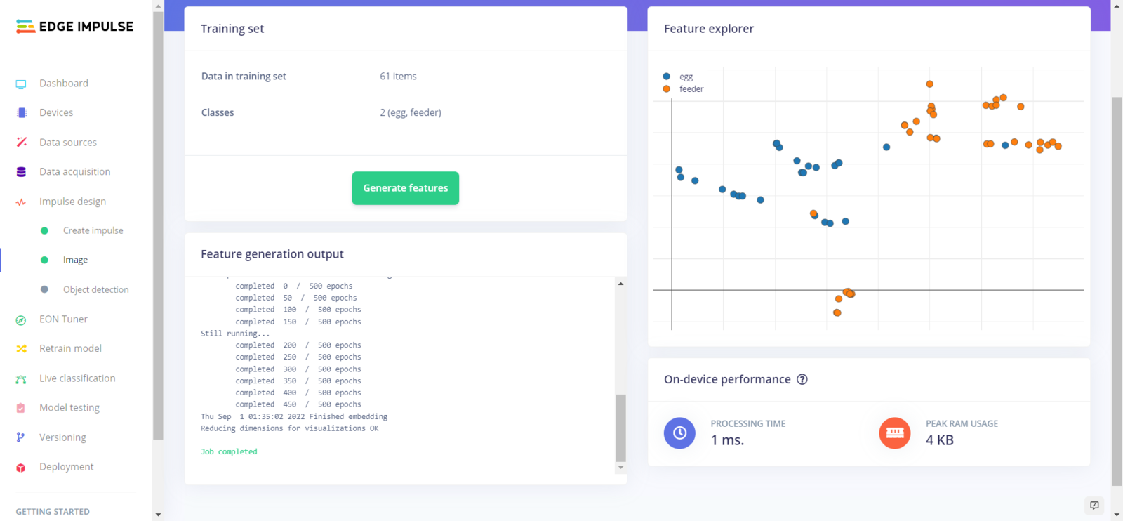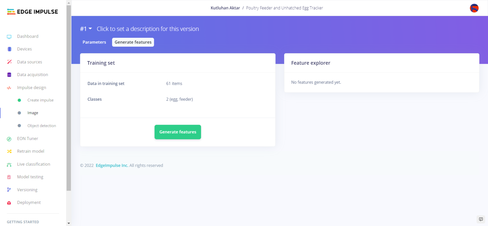 After collecting training and testing image samples, I uploaded them to my project on Edge Impulse. Then, I labeled the filled poultry feeder and the daily produced eggs on each sample with egg and feeder classes. Since I have a plastic ground poultry feeder in my quail cage, I decided to train my object detection model on recognizing the filled feeding holes. If the model cannot detect any feeding holes, which means that the poultry feeder needs to be refilled. :hash: First of all, sign up for Edge Impulse and create a new project.