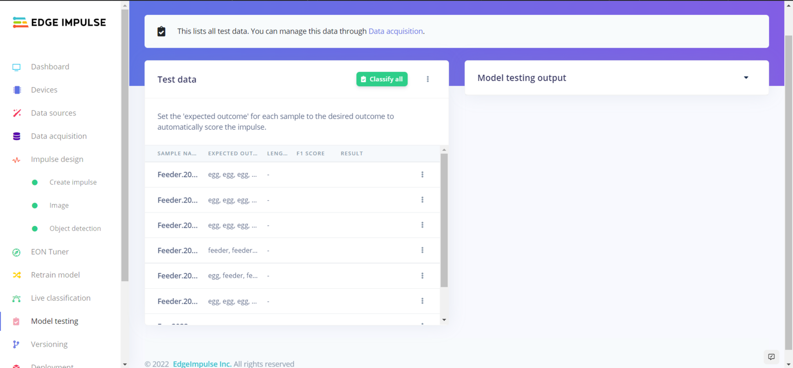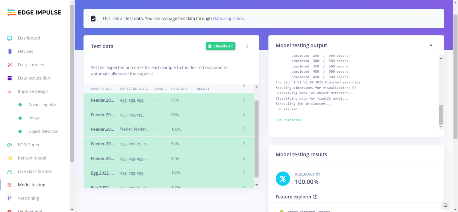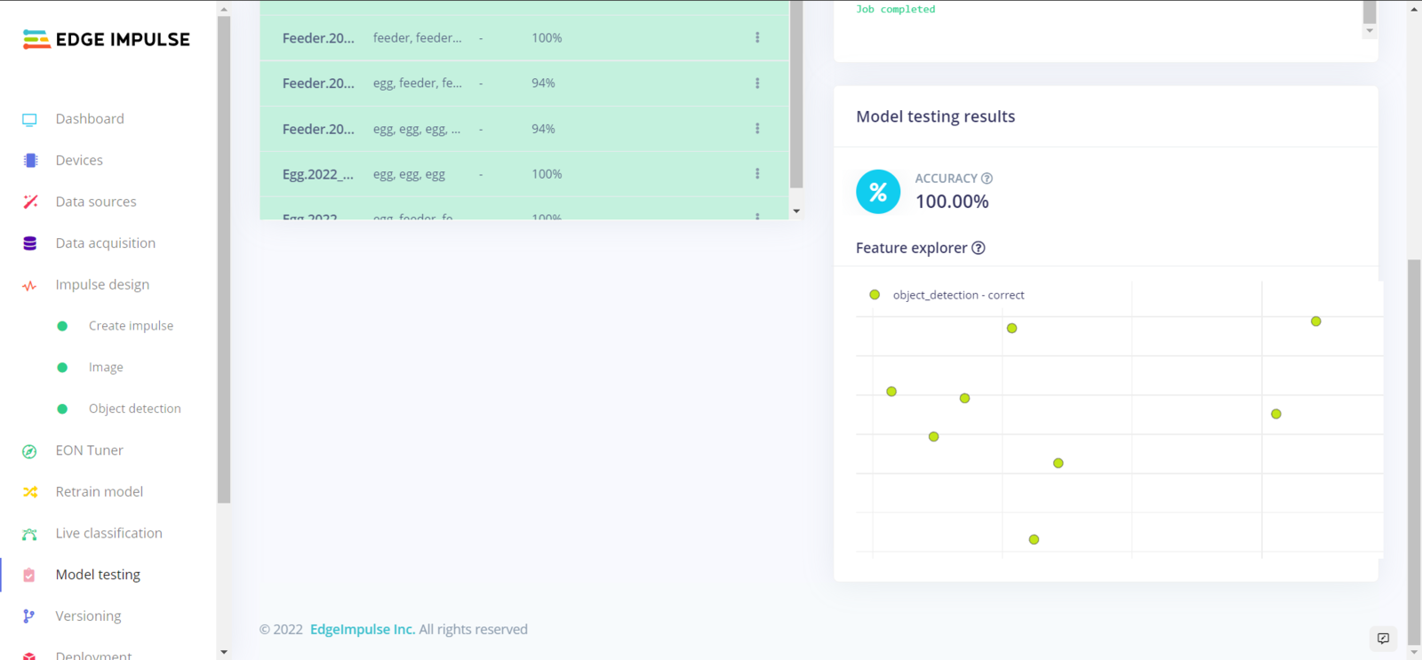 After building and training my object detection model, I tested its accuracy and validity by utilizing testing image samples. The evaluated accuracy of the model is 100%. :hash: To validate the trained model, go to the Model testing page and click Classify all.