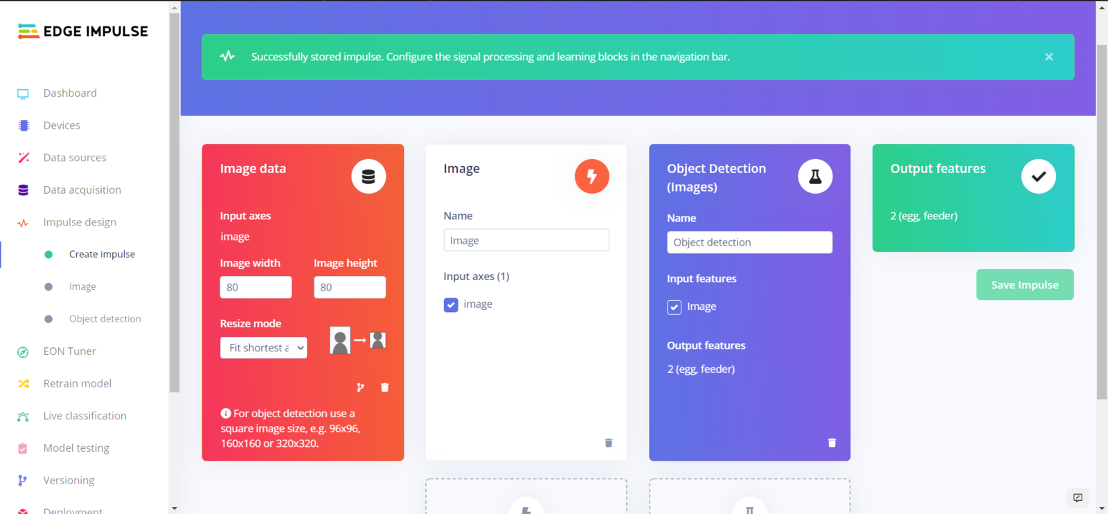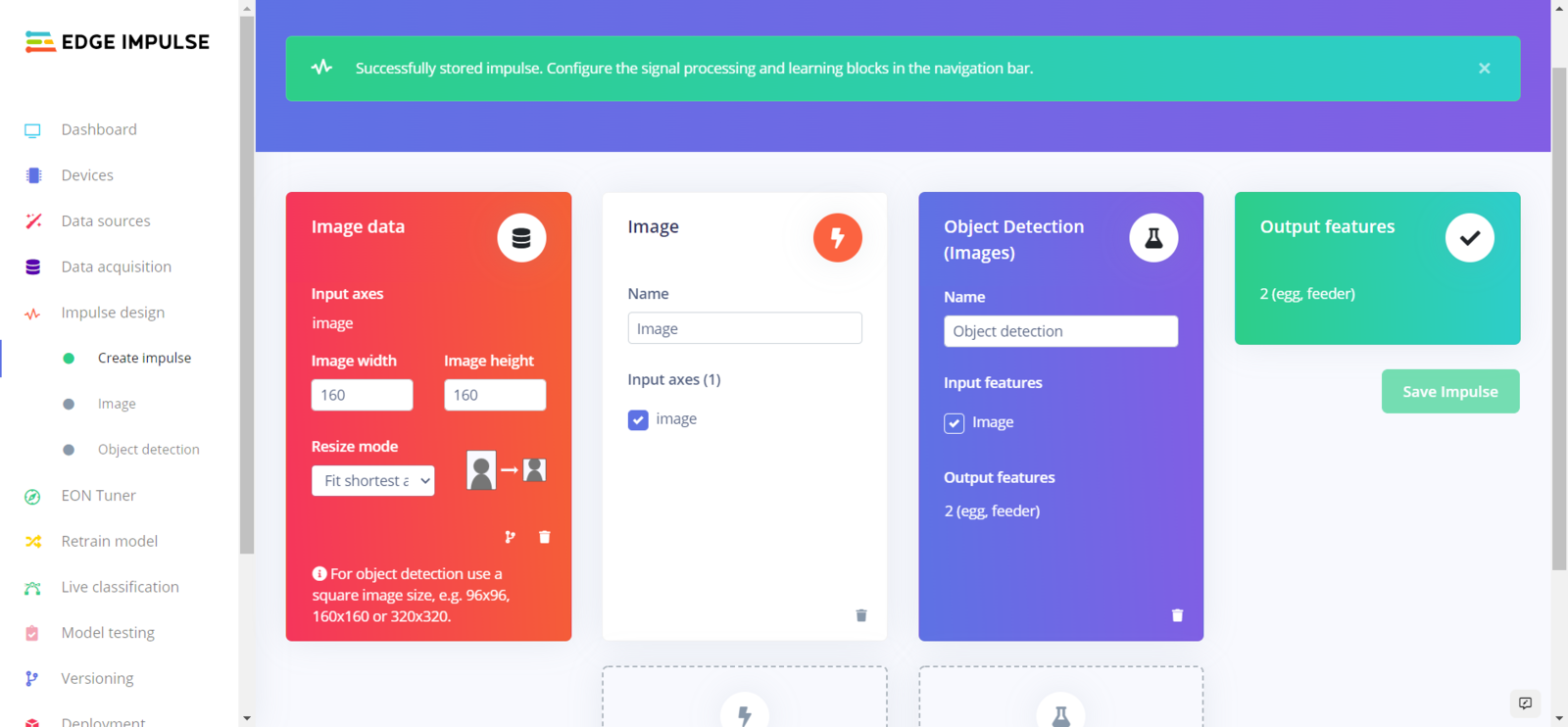 After labeling my training and testing samples successfully, I designed an impulse and trained it on detecting the two mentioned classes — egg and feeder. An impulse is a custom neural network model in Edge Impulse. I created my impulse by employing the Image preprocessing block and the Object Detection (Images) learning block. The Image preprocessing block optionally turns the input image format to grayscale and generates a features array from the raw image. The Object Detection (Images) learning block represents a machine learning algorithm that detects objects on the given image, distinguished between model labels (egg and feeder). :hash: Go to the Create impulse page and set image width and height parameters to 160. Then, select the resize mode parameter as Fit shortest axis so as to scale (resize) given training and testing image samples. :hash: Select the Image preprocessing block and the Object Detection (Images) learning block. Finally, click Save Impulse.
